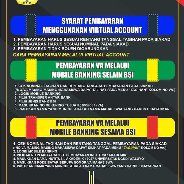 Alur pembayaran SPP VIRTUAL ACCOUNT dapat dilihat melalui https://wa.me/p/9785676238140865/6285867944905 , ataudapat dilihat pada contoh video tutorial melalui https://tinyurl.com/VideoTutorialPembayaranAlur pembayaran SPP Bulanan NON VIRTUAL ACCOUNT , dibayarkan ke rekening BRI 0327-01-000598-30-8 a.n Universitas Ngudi WaluyoBukti bayar diuploud ke https://tinyurl.com/ValidasiPembayaran dengan menunggu tervalidasi lunas sesuai banyaknya antrian.