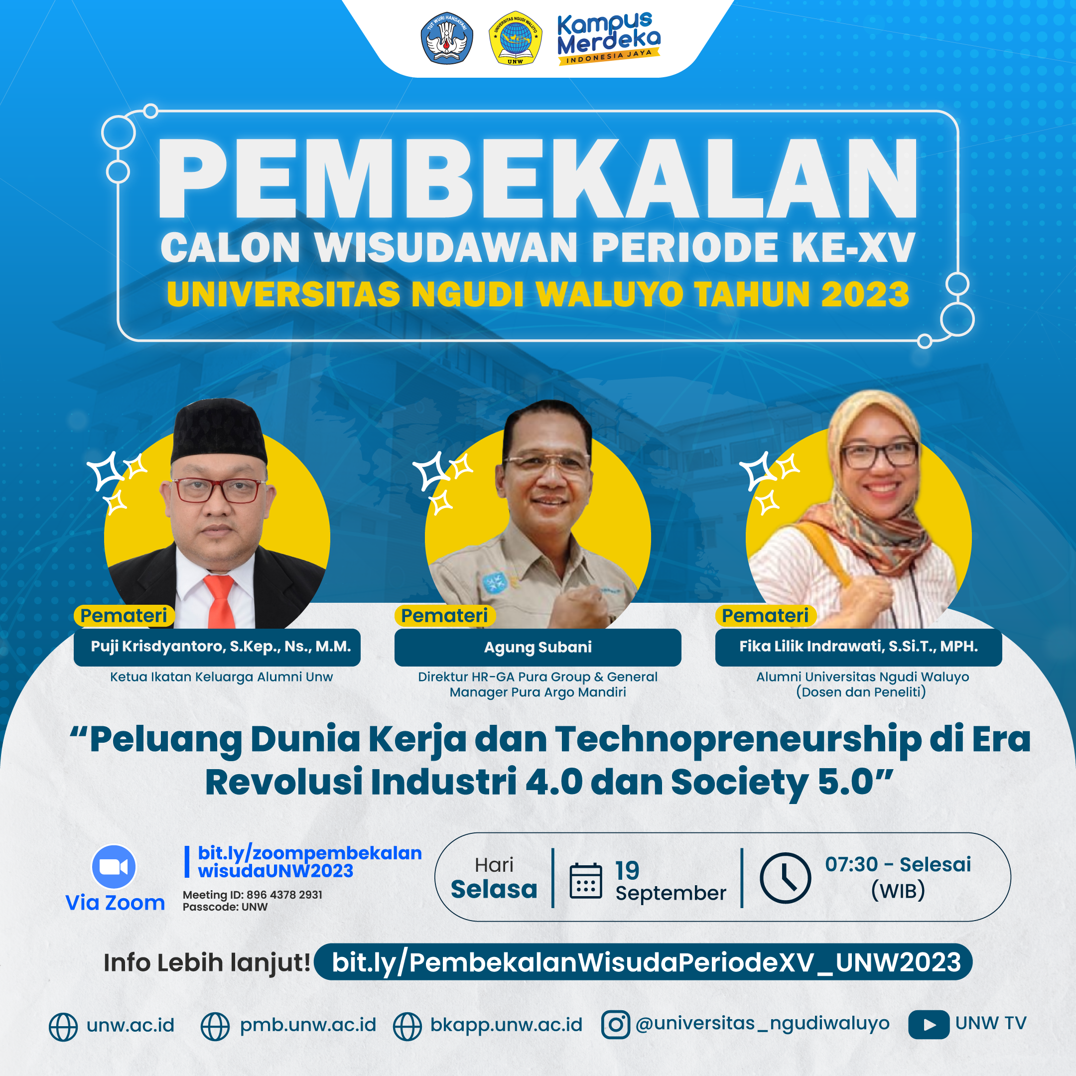 Berikut kami sampaikan informasi terkait pelaksanaan Pembekalan dan Gladi Wisuda XV Periode September 2023 adalah sebagai berikut :1. PEMBEKALAN WISUDAPembekalan bagi calon wisudawan/ti dilaksanakan pada :Hari : SelasaTanggal : 19 September 2023Waktu : 07.30 WIB - selesai Tempat : Melalui Zoom Meeting dg alamat Topic: Pembekalan Calon Wisudawan Periode ke-XV Universitas Ngudi Waluyo Tahun 2023 Time: Sep 19, 2023 07:30 AM Jakarta Join Zoom Meeting https://bit.ly/zoompembekalanwisudaUNW2023 Meeting…
