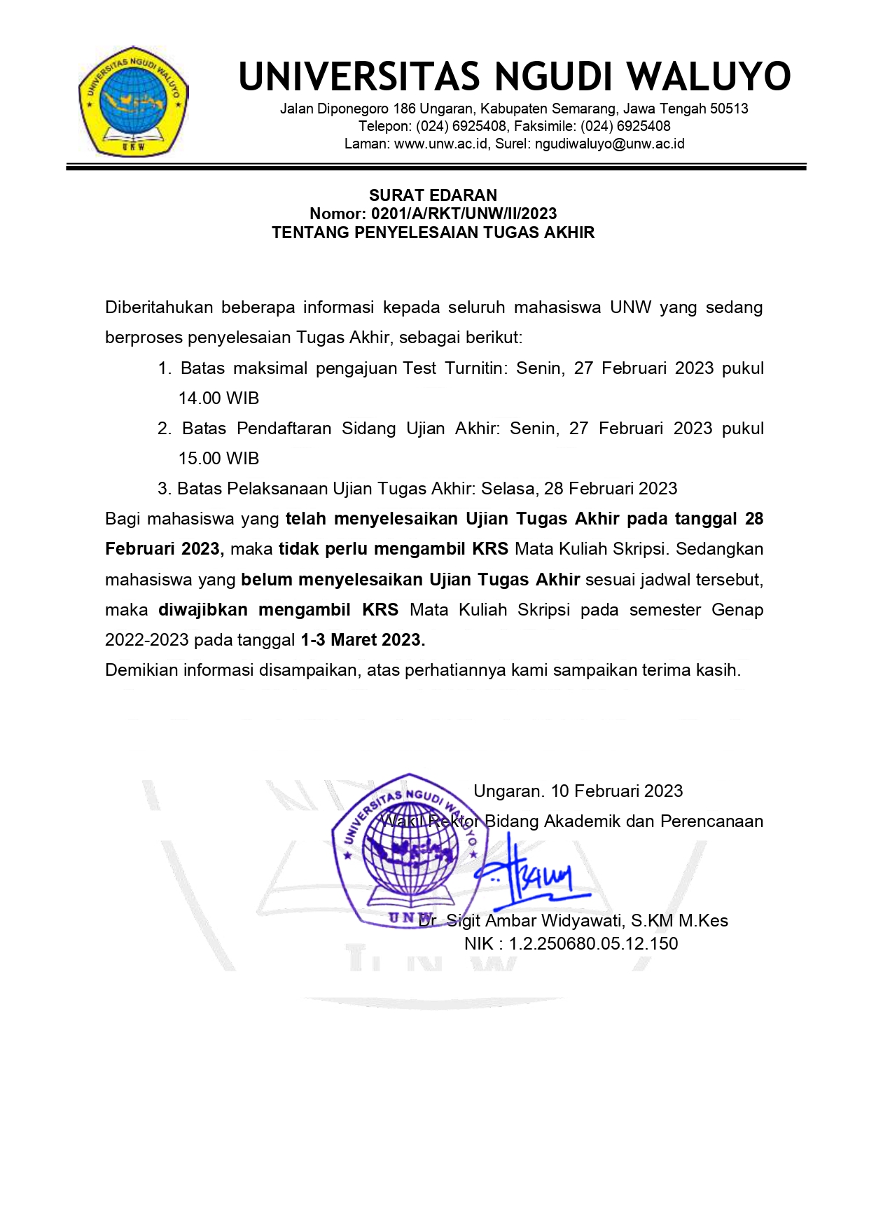 Telah disahkan sebagai Mahasiswa Universitas Ngudi Waluyo, di Ungaran, Maret 2023 oleh Rektor Universitas Ngudi Waluyo. Prof. Dr. Subyantoro, M.Hum.