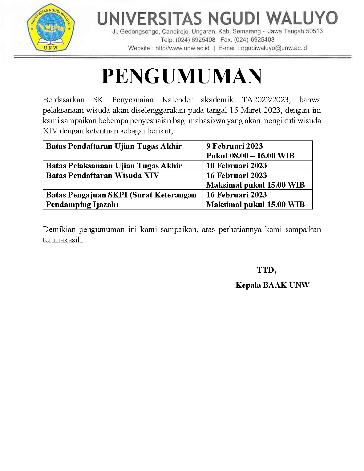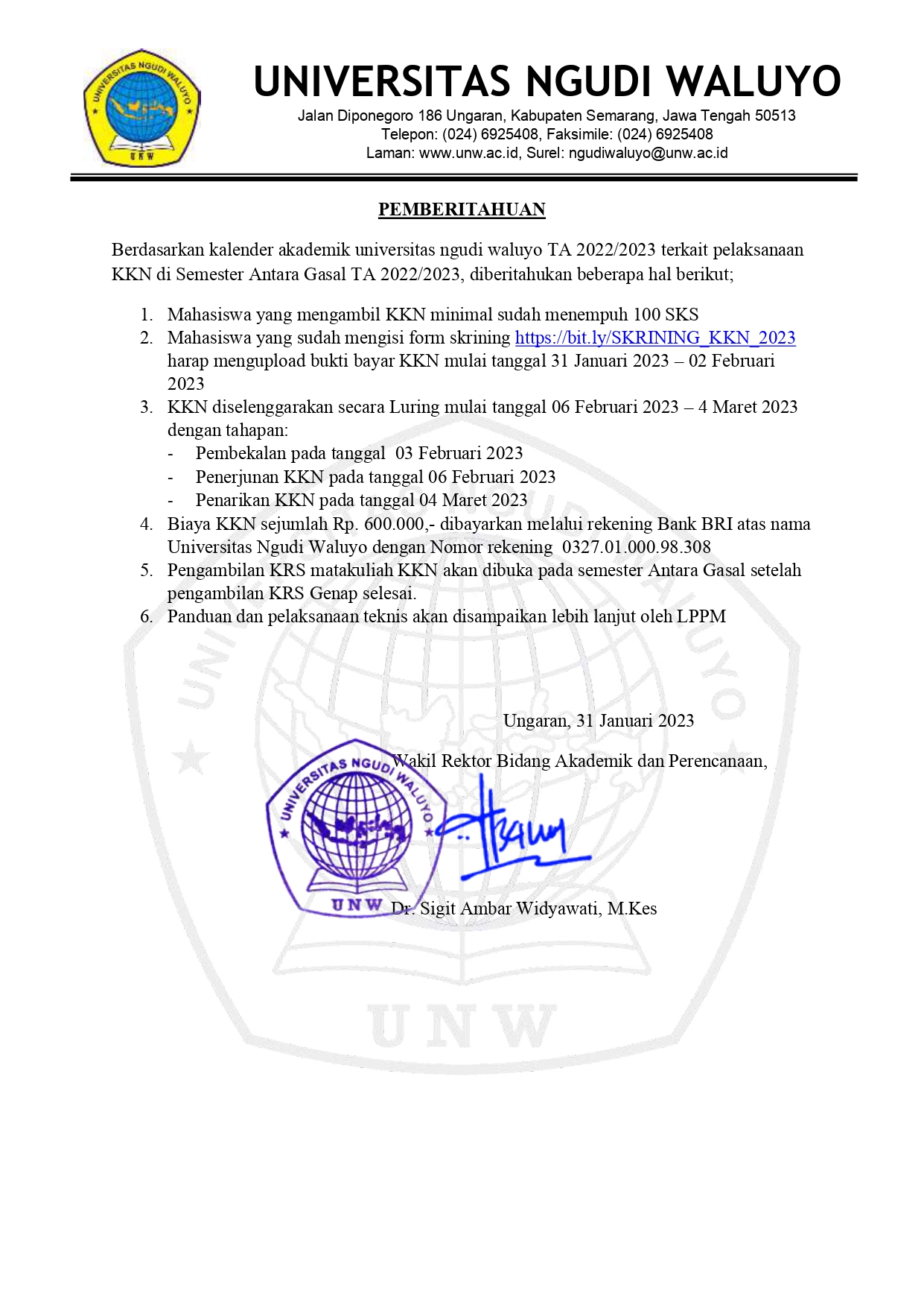 Diberitahukan kepada:Dosen Universitas Ngudi Waluyo, bahwa sehubungan dengan berakhirnya kegiatan pembelajaran pada Semester Gasal T.A 2022/2023 maka bersama ini kami sampaikan hasil evaluasi dosen oleh mahasiswa (EDOM) yang dapat digunakan sebagai masukan bagi perbaikan proses pembelajaran pada semester berikutnya. Adapun hasil EDOm dapat diakses pada link berikut : https://bit.ly/HasilEDOMSasal22-23 Terimakasih