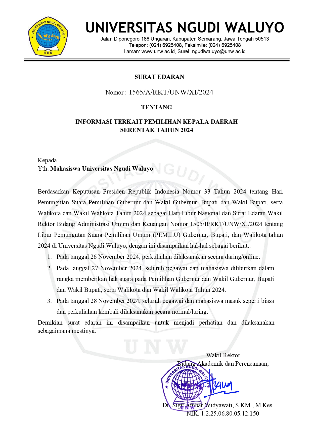 Diberitahukan kepada mahasiswa Universitas Ngudi Waluyo bahwa pendaftaran Sumpah Profesi periode Desember 2024 telah dibuka. Berikut kami sampaikan beberapa informasi terkait pelaksanaan Sumpah Profesi :1. Sumpah Profesi dilaksanakan pada tanggal 17 Desember 2024 pukul 07.30 WIB di Aula Universitas Ngudi Waluyo. Dengan ketentuan pakaian sebagai berikut :Untuk Wanita memakai kebaya warna biru navy dengan belahan dada tidak terlalu rendah dan belahan paha yang tidak terlalu tinggi (maksimal belahan di lutut)Untuk yang laki-laki menggunakan kemeja putih, jas hitam dan dasi biru navy.Contoh warna biru navy dapat dilihat pada link berikut https://www.motodw.com/product-page/navy-blue2. Gladi Bersih diadakan pada tanggal 16 Desember 2024 pukul 07.30 WIB di Aula Universitas Ngudi Waluyo. Pakaian bebas, rapi, sopan dan bersepatu.3. Batas pendaftaran Sumpah Profesi Periode Desember ini adalah tanggal 2 Desember 2024.4. Pendaftaran Sumpah Profesi dilakukan di akun SIAKAD masing-masing…