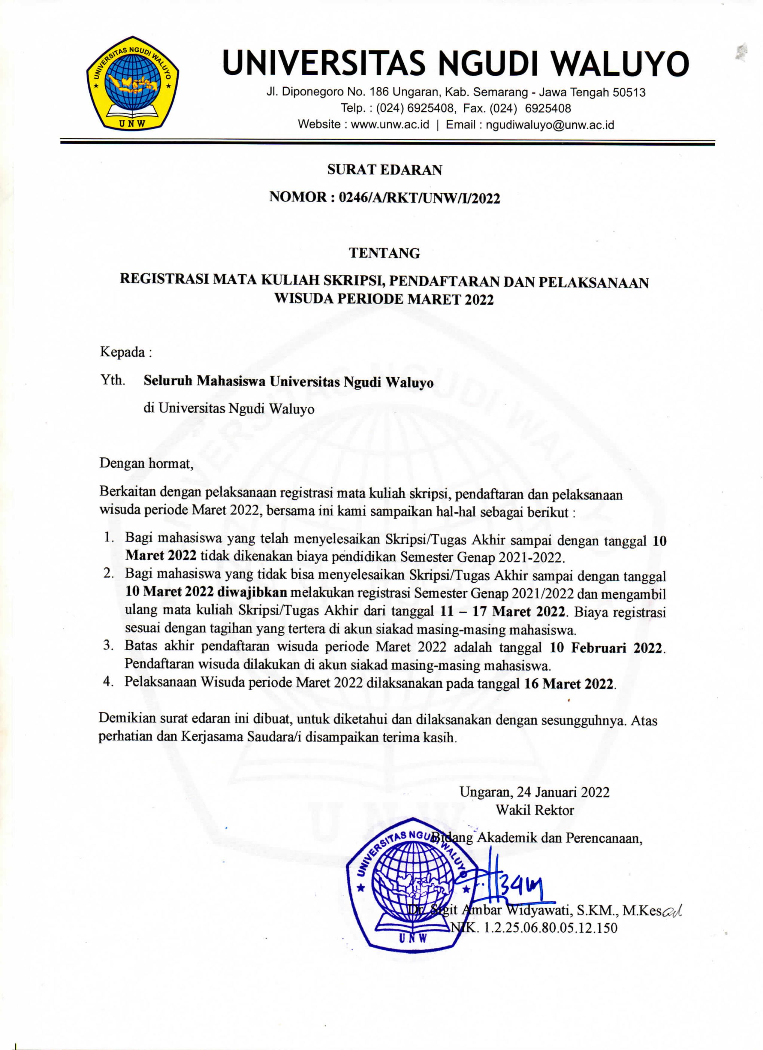 Berikut kami sampaikan informasi berkaitan dengan pelaksanaan KKN :1. Pendaftaran KKN dilaksanakan mulai tanggal 26 – 31 Januari 2022 di link google form https://tinyurl.com/kkn2022unw2. Registrasi matakuliah KKN di SIAKAD dilaksanakan setelah registrasi Semester Genap 2021/2022 di tutup (untuk informasi tanggalnya akan diberitahukan kembali).3. Mahasiswa yang mengambil matakuliah KKN harus sudah menempuh minimal 100 sks tanpa nilai E.4. Calon Peserta wajib menyertakan dan mengunggah berkas persyaratan sebagai berikut : a. foto berwarna dengan background merah (format nama soft file nim_nama_prodi_fakultas) b. surat ijin persetujuan dari orang tua c. surat keterangan sehat dari dokter yang berwenang di daerah setempat d. bukti pembayaran pelaksanaan KKN dalam bentuk soft file dengan format nama file nim_nama_prodi_fakultas4. Batas akhir pemberkasan adalah…