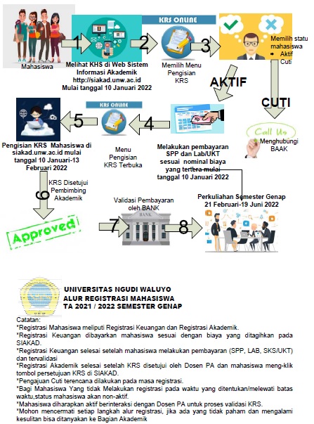 Diberitahukan kepada seluruh mahasiswa Universitas Ngudi Waluyo bahwa Registrasi Administrasi dan Akademik (Pengisian KRS) semester genap TA. 2021/2022 secara online sudah bisa dimulai 21 Januari s/d 13 Februari 2022. Alur Registrasi dapat dilihat di akun masing-masing mahasiswa dan jadwal perkuliahan di tiap program studi dapat di download pada lampiran di bawah ini.Untuk mata kuliah yang tidak ada di penawaran silahkan disampaikan ke ketua program studi masing-masing .Apabila informasi tersebut belum jelas silahkan menghubungi Bagian Akademik masing-masing program studi.Terima kasih.TTD BAAK UNW