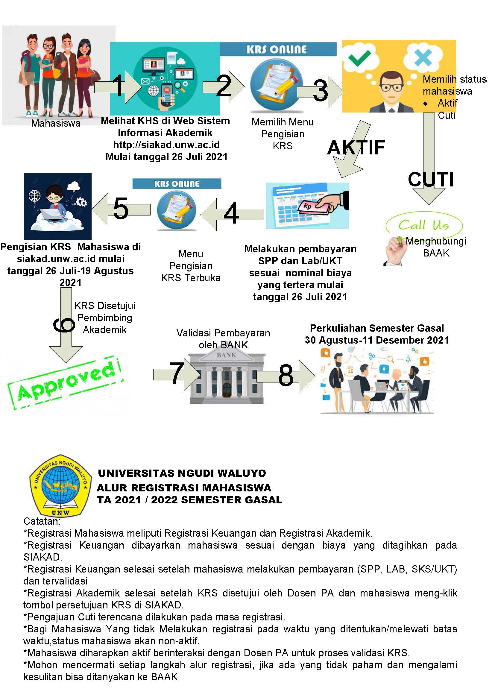 Diberitahukan kepada seluruh mahasiswa Universitas Ngudi Waluyo bahwa Registrasi Administrasi dan Akademik (Pengisian KRS) semester gasal TA. 2021/2022 secara online sudah bisa dimulai 26 Juli s/d 19 Agustus 2021. Alur Registrasi dapat dilihat di akun masing-masing mahasiswa dan jadwal perkuliahan di tiap program studi dapat di download pada lampiran di bawah ini.Untuk mata kuliah yang tidak ada di penawaran silahkan disampaikan ke ketua program studi masing-masing .Apabila informasi tersebut belum jelas silahkan menghubungi BAAK UNW.Terima kasih.TTD BAAK UNW