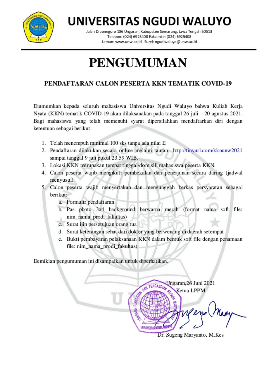 Berikut kami sampaikan pengumuman terkait prosedur pelaksanaan kegiatan Kuliah Kerja Nyata (KKN) periode Semester Genap TA 2020/2021 Universitas Ngudi Waluyo. Silahkan melengkapi berkas sesuai yang dipersyaratkan dan melakukan Registrasi pengisian KRS di SIAKAD. Biaya KKN sebesar 3 SKS Praktik sesuai yang tertera pada menu pengambilan KRS di SIAKAD. Lampiran dapat di download di bawah ini.Terima kasih.Ka. LPPM UNW