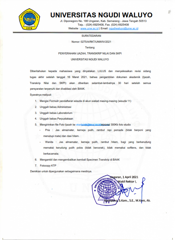 Berikut kami informasikan Surat Edaran Nomor 0275/A/RKT/UNW/IV/2021 (terlampir) Mengenai Penyerahan Dokumen Akademik. Hal-hal yang kurang jelas dapat ditanyakan di Biro Administrasi Akademik dan Kemahasiswaan. ttdBAAK