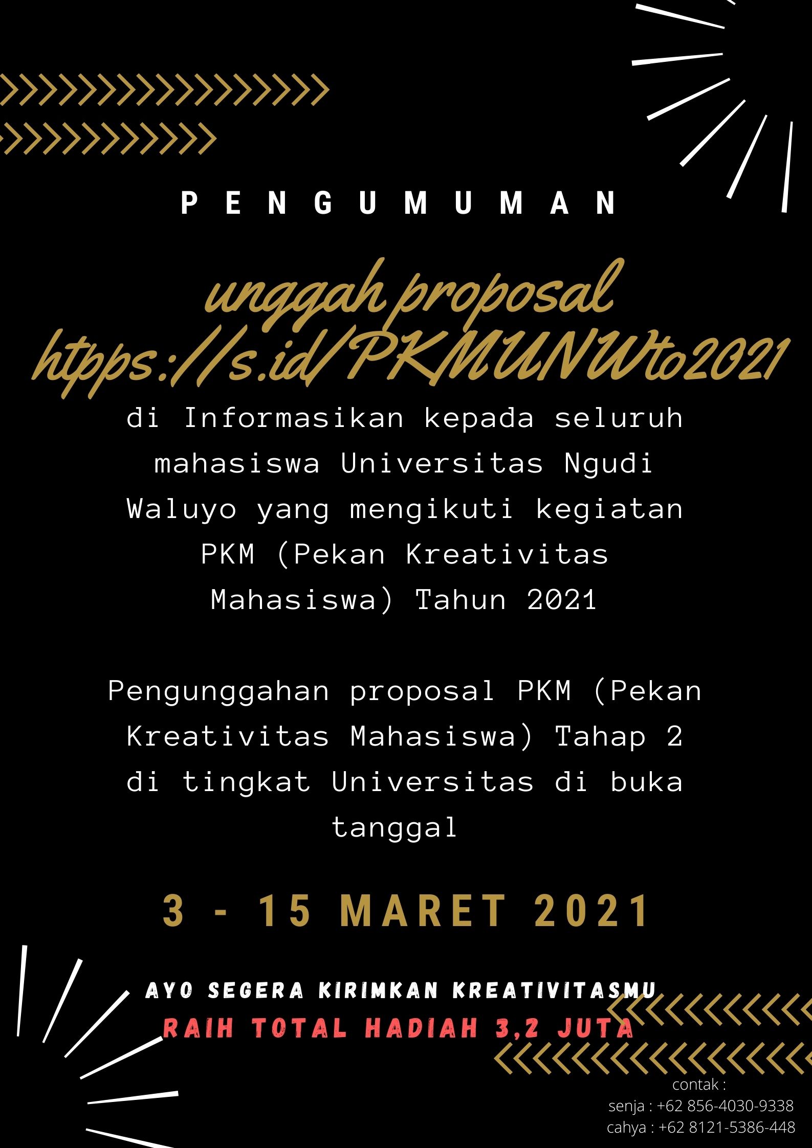 PENGUMUMAN Bersama ini kami sampaikan jadwal pelaksanaan kegiatan Wisuda X periode Maret tahun 2021 sebagai berikut :Hari, tanggal : RABU, 17 MARET 2021Waktu : 07.30 s/d selesaiTempat : Universitas Ngudi Waluyo Jl. Diponegoro No 186 Ungaran Kab. Semarang Kegiatan wisuda akan dilaksanakan secara Luring/Drive Thru dengan tetap memperhatikan protokol kesehatan. Bagi yang berhalangan hadir, Panitia menyelenggarakan acara secara daring di hari dan jam yang sama melalui zoom.Berikut kami sertakan link untuk KONFIRMASI KEHADIRAN https://s.id/kehadiranwisuda mohon diisi selambat-lambatnya hari KAMIS, 4 MARET 2021 pukul 14.00 wib.Untuk teknis pelaksanaan kegiatan dan informasi lainnya akan kami sampaikan di kemudian hari. Terima kasih.TTD,Ketua Panitia