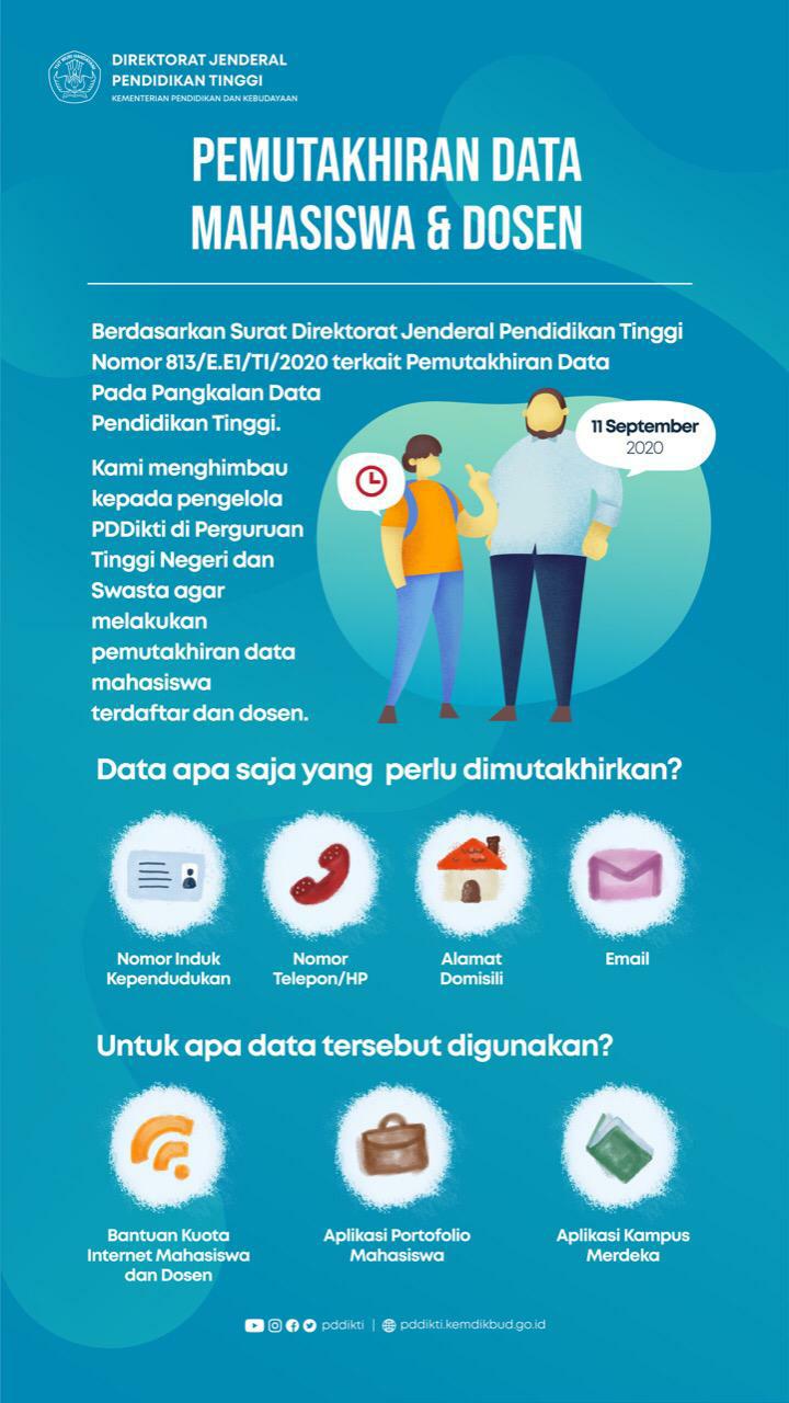 Berdasarkan Surat DIRJEN DIKTI Nomor 813/E.E1/TI/2020 terkait pemuktahiran data pada PDDIKTI, disampaikan kepada mahasiswa Aktif Universitas Ngudi Waluyo yang registrasi aktif di semester gasal TA 2020/2021 untuk segera melengkapi data diri di siakad.unw.ac.id paling lambat tanggal 8 september 2020, data yang dilengkapi meliputi, NIK(Nomor INDUK KEPENDUDUKAN),Nomor Handphone, Alamat Domisili, Email, FOTO diri mahasiswa, data orangtua. Data identitas yang lainnya tidak menjadi syarat yang dilaporkan, tetapi juga wajib dilengkapi mahasiswa di siakad.unw.ac.id. Data tersebut akan dilaporkan ke PDDIKTI dan digunakan untuk bantuan kuota internet mahasiswa dari KEMENDIKBUD.