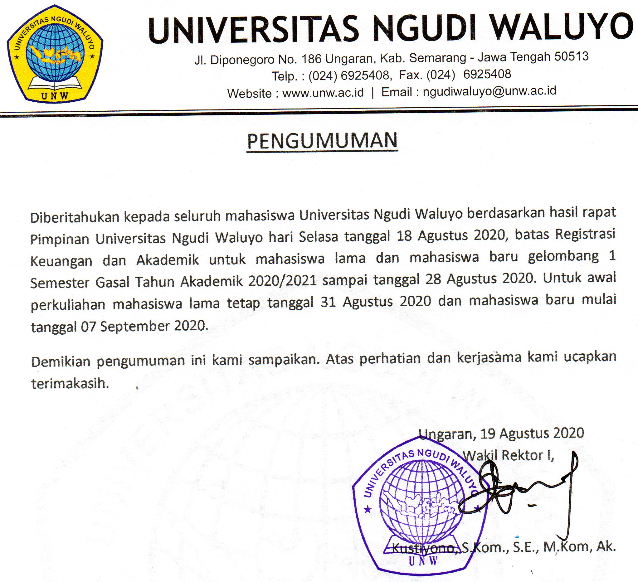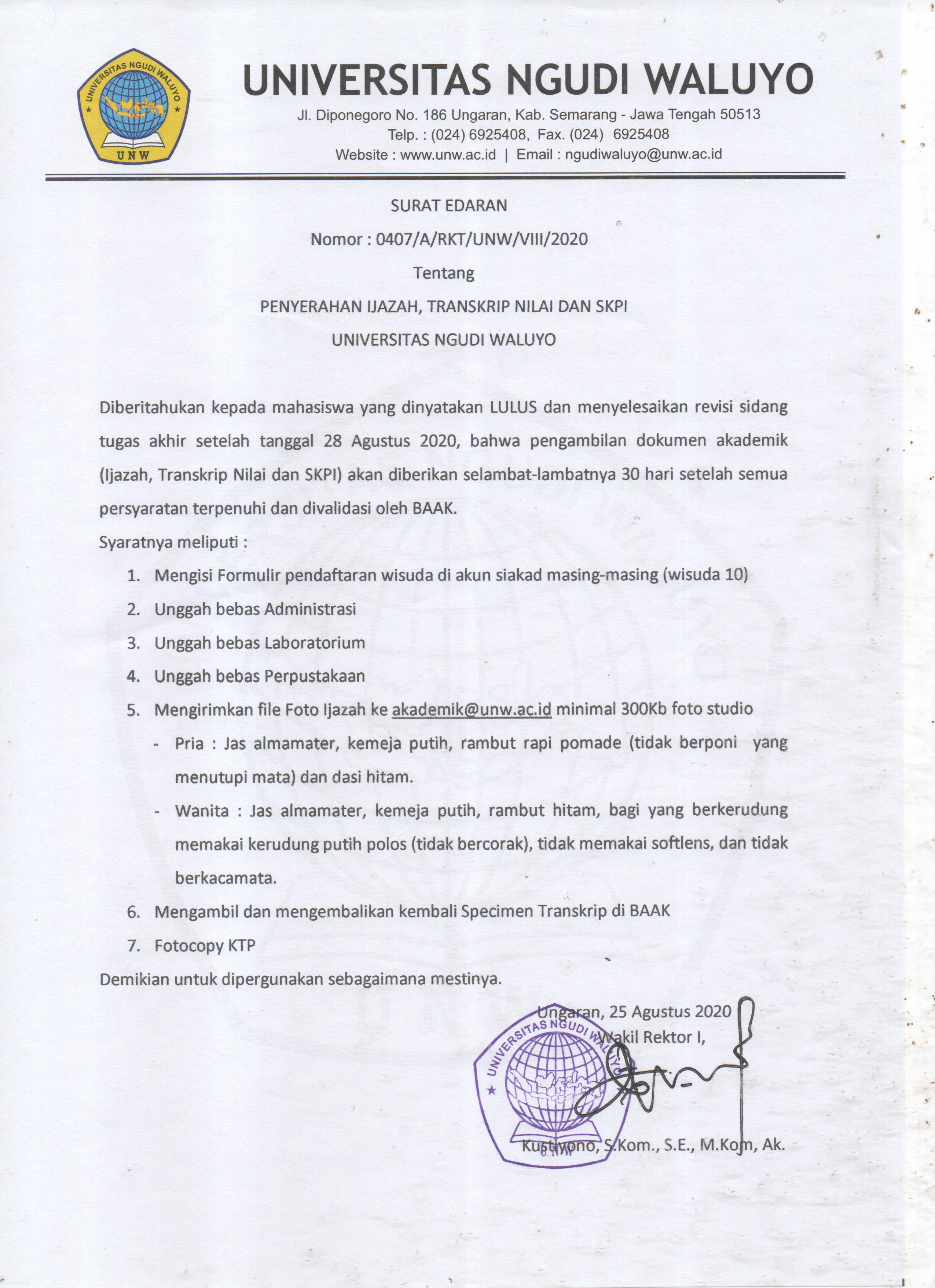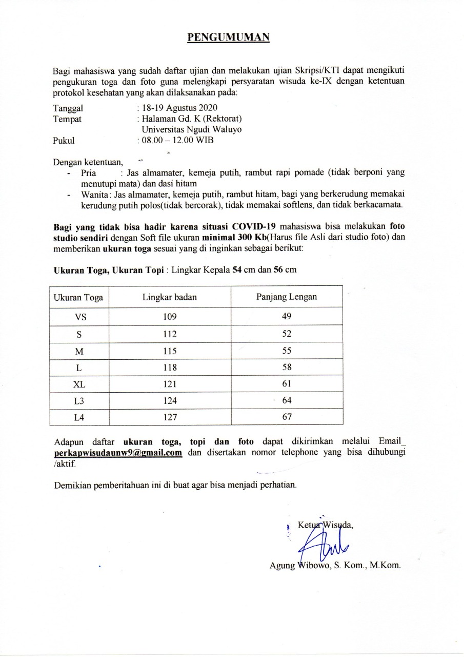 Diberitahukan kepada mahasiswa Universitas Ngudi Waluyo yang telah dinyatakan LULUS pada sidang tugas akhir untuk segera melakukan pendaftaran Wisuda ke- 9 di akun SIAKAD masing-masing paling lambat tanggal 28 Agustus 2020 dengan persyaratan sebagai berikut:1. Membayar biaya wisuda ke 9 sebesar Rp. 1.250.000,- untuk nomor rekening dan kode unik pembayaran terlampir2. Unggah bebas Administrasi dengan ketentuan lunas semua biaya termasuk biaya wisuda (Up. Bapak Agus +62 895-1542-0400)3. Unggah bebas Laboratorium untuk formulir terlampir dan dimintakan tanda tangan.4. Unggah bebas perpustakaan untuk alur terlampir5. File foto ijazah dan ukur toga (apabila mahasiswa akan mengirim foto harus sesuai format yang ditentukan jika tidak maka ijazah tidak bisa tercetak) format terlampir up bu faita +62 857-2728-4597Adapun pelaksanaan kegiatan WISUDA ke-9 Universitas Ngudi Waluyo sesuai dengan kalender akademik yaitu tanggal 16 dan 17 September 2020. Simulasi…