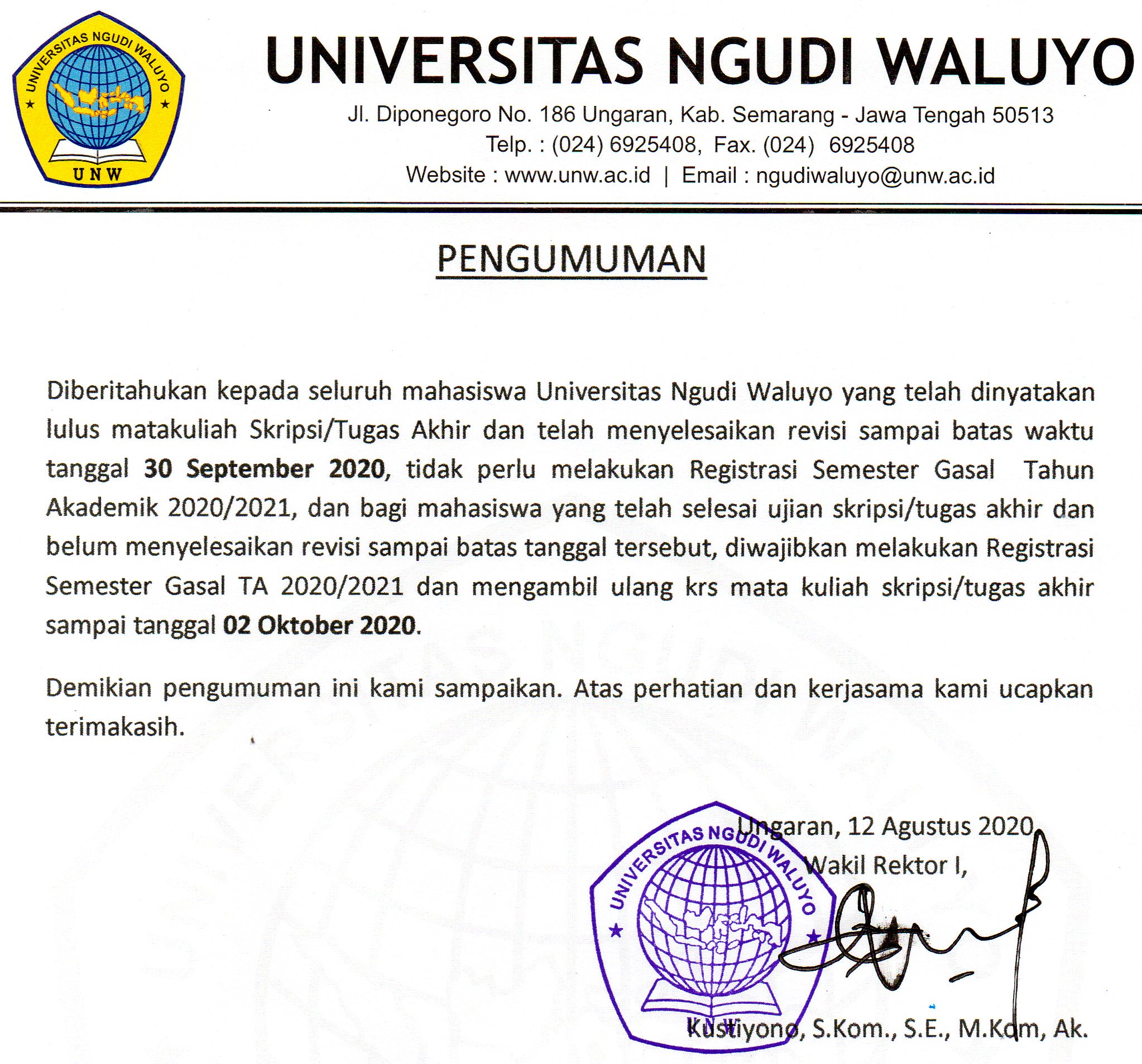 Diberitahukan kepada seluruh mahasiswa Universitas Ngudi Waluyo bahwa Registrasi Administrasi dan Akademik (Pengisian KRS) secara online sudah bisa dimulai 27 Juli s/d 17 Agustus 2020. Alur Registrasi dapat dilihat di akun masing2 mahasiswa dan jadwal perkuliahan di tiap program studi dapat di download pada lampiran di bawah ini.Untuk mata kuliah yang tidak ada di penawaran silahkan disampaikan ke ketua program studi masing-masing .Apabila informasi tersebut belum jelas silahkan menghubungi BAAK UNW.Terima kasih.TTD BAAK UNW