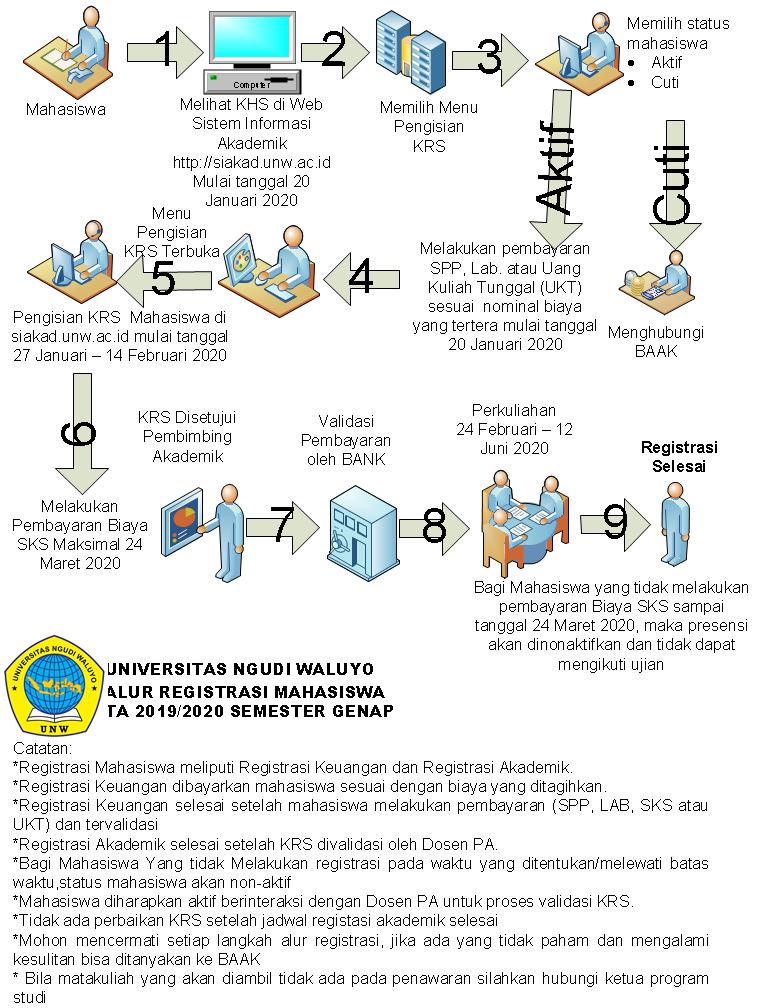 Diberitahukan kepada seluruh mahasiswa Universitas Ngudi Waluyo bahwa Registrasi Administrasi dan Akademik (Pengisian KRS) secara online sudah bisa dimulai 27 Januari s/d 14 Februari 2020. Alur Registrasi dan jadwal perkuliahan di tiap program studi dapat di download pada lampiran di bawah ini. Untuk mata kuliah yang tidak ada di penawaran silahkan disampaikan ke ketua program studi masing-masing .Apabila informasi tersebut belum jelas silahkan menghubungi BAAK UNW.Terima kasih.TTD BAAK UNW