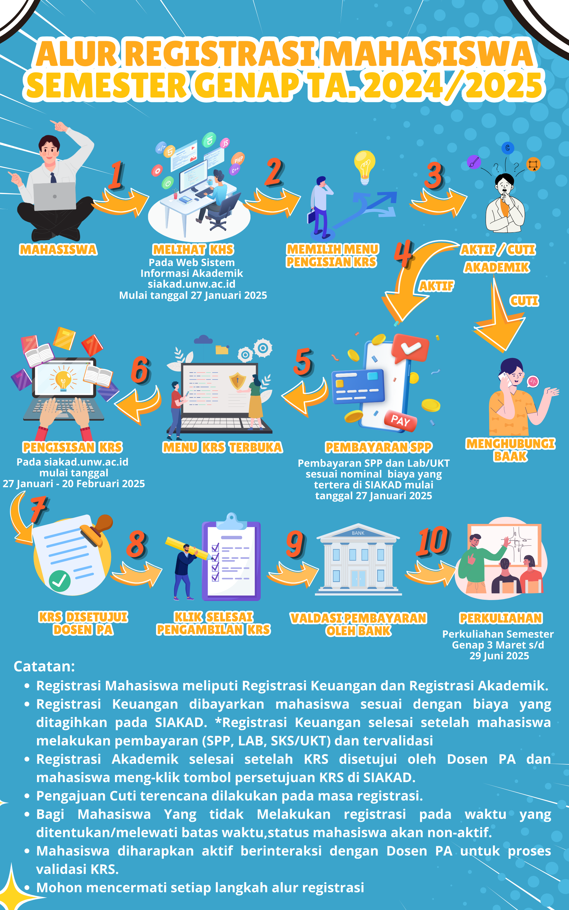 Diberitahukan kepada seluruh mahasiswa Universitas Ngudi Waluyo bahwa Registrasi Administrasi dan Akademik (Pengisian KRS) Semester Genap TA. 2024/2025 secara online sudah bisa dimulai 27 Januari s/d 5 Februari 2025. Alur Registrasi dapat dilihat di akun masing-masing mahasiswa dan jadwal perkuliahan di tiap program studi dapat di download pada lampiran di bawah ini.Untuk mata kuliah yang tidak ada di penawaran silahkan disampaikan ke ketua program studi masing-masing .Apabila informasi tersebut belum jelas silahkan menghubungi Bagian Akademik masing-masing program studi.Terima kasih.TTD BAAK UNW