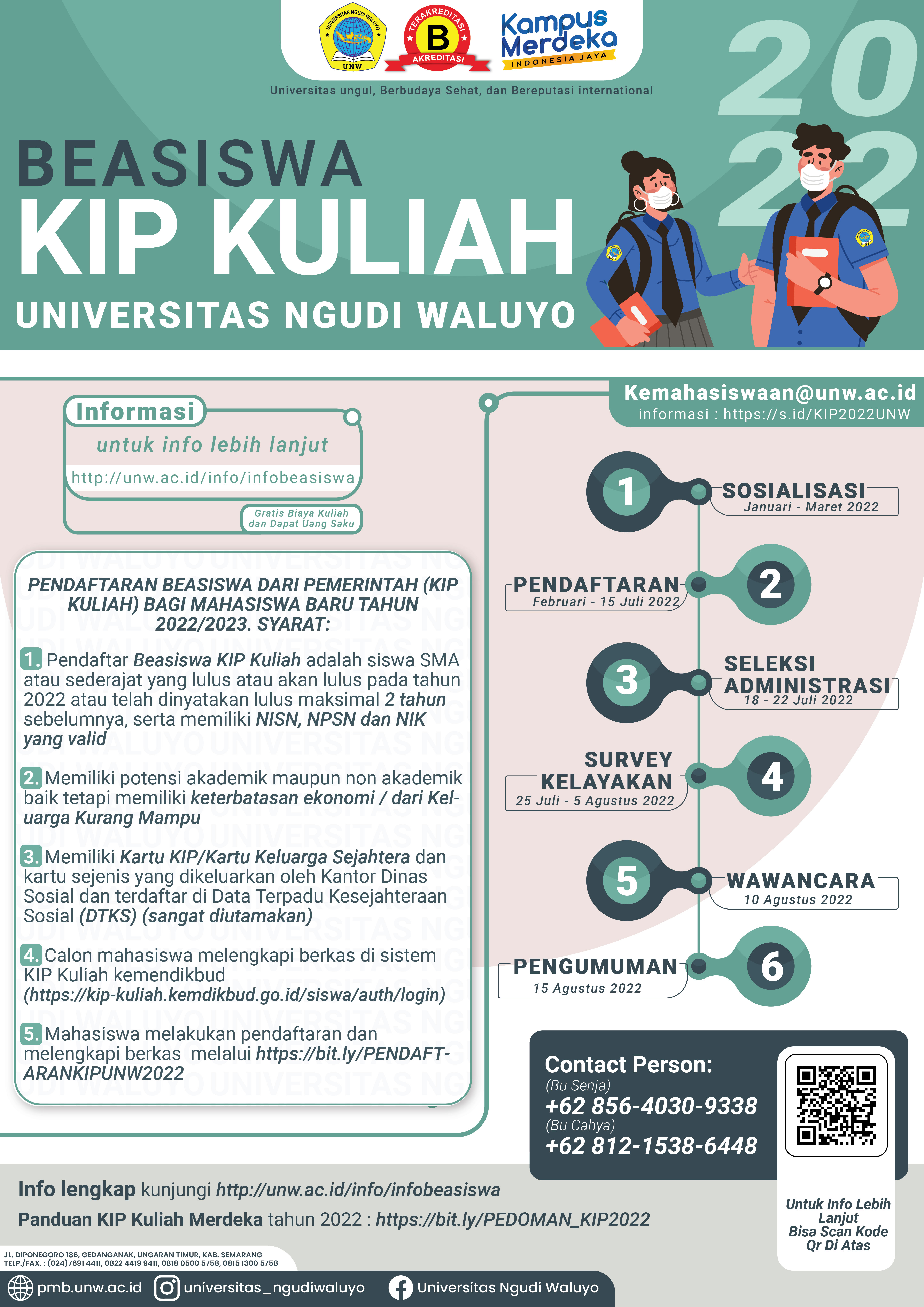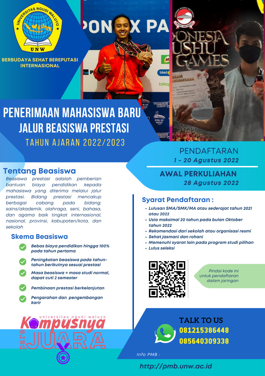 PENDAFTARAN BEASISWA PRESTSI (PMDP) BAGI MAHASISWA BARU TAHUN 2022/2023SYARAT:Lulusan SMA/SMK/MA atau sederajat pada tahun berjalan atau maksimal 1 tahun sebelumnyaUsia maksimal 20 tahun pada bulan Oktober tahun berjalan/pendaftaran.Mempunyai prestasi sesuai dengan ketetapan UNW.Mendapatkan rekomendasi dari sekolah atau organisasi resmi yang memiliki kewenangan untuk memberikan rekomendasi.Sehat jasmani dan rohani yang dibuktikan dengan surat keterangan sehat dari institusi kesehatan minimal setingkat Puskesmas.Memenuhi syarat lain yang ditentukan untuk mendaftar pada program studi pilihan.untuk pendaftaran silahkan scand barcode pada flayer.