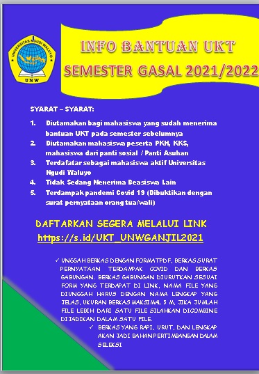 Selamat kepada mahasiswaUNW yang telah mengajukan bantuan biaya UKT/SPP semester genap tahun ajran 2020/2021 dan Lolos mendapatkan bantuan biaya UKT/SPP Tahun 2021. Bagi mahasiswa yang namanya tercantum dalam SK terlampir, Bantuan akan diberikan secara tunai di bagian keuangan. Adapun syarat pengambilan bantuan UKT / SPP adalah: 1. Tidak memiliki tunggakan pembayaran perkuliahan (UKT/SPP/SKS dsb)2. KTM asli3. SK Bantuan biaya UKT4. KTP asliBantuan UKT / SPP bisa mulai diambil dengan tetap memperhatikan protokol kesehatan pada:Hari : SeninTanggal : 19 April 2021Waktu : 09.00 - 13.00 WIB