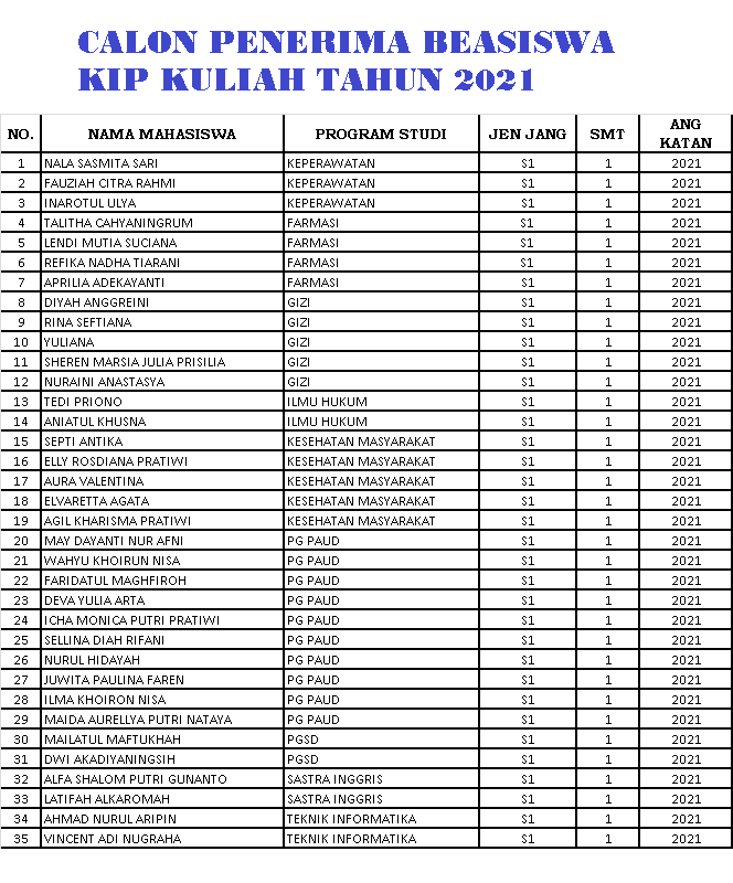 Berikut kami sampaikan daftar mahasiswa yang lolos seleksi program KIP Kuliah Universitas Ngudi Waluyo, untuk langkah selanjutnya bagi calon mahasiswa yang diterima harap melakukan konfirmasi kesediaan sebagai langkah awal registrasi ke bagian Kemahasiswaan pada WAG yang telah dibuat. Kami tunggu konfirmasi kesediaan paling lambat hari Senin tanggal 09 Agustus 2021 pukul 15.00 WIB.Kami Ucapkan Selamat bergabung di UNW.