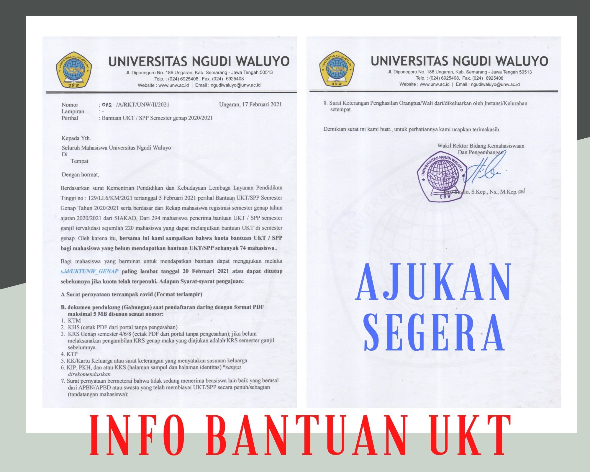 Berdasarkan surat Kementrian Pendidikan dan Kebudayaan Lembaga Layanan Pendidikan Tinggi no : 129/LL6/KM/2021 tertanggal 5 Februari 2021 perihal Bantuan UKT/SPP Semester Genap Tahun 2020/2021 serta berdasar dari Rekap mahasiswa registrasi semester genap tahun ajaran 2020/2021 dari SIAKAD, Bersama ini kami sampaikan hasil validasi mahasiswa yang dapat melanjutkan bantuan UKT/SPP semester Genap. Dari 294 mahasiswa penerima bantuan UKT / SPP semester ganjil tervalidasi sejumlah 220 mahasiswa yang dapat melanjutkan bantuan UKT di semester genap. Bagi mahasiswa yang namanya tercantum dalam lampiran surat ini, untuk dapat melengkapi berkas surat terdampak covid (format terlampir), dan diunggah ke https://s.id/UKTUNW_GENAP paling lambat tanggal 19 Februari 2021. Bagi mahasiswa yang namanya tercantum dalam lampiran surat ini, bantuan akan diberikan secara tunai di bagian keuangan setelah pencairan bantuan dari Kementrian Pendidikan dan Kebudayaan Direktorat Pendidikan Tinggi masuk…