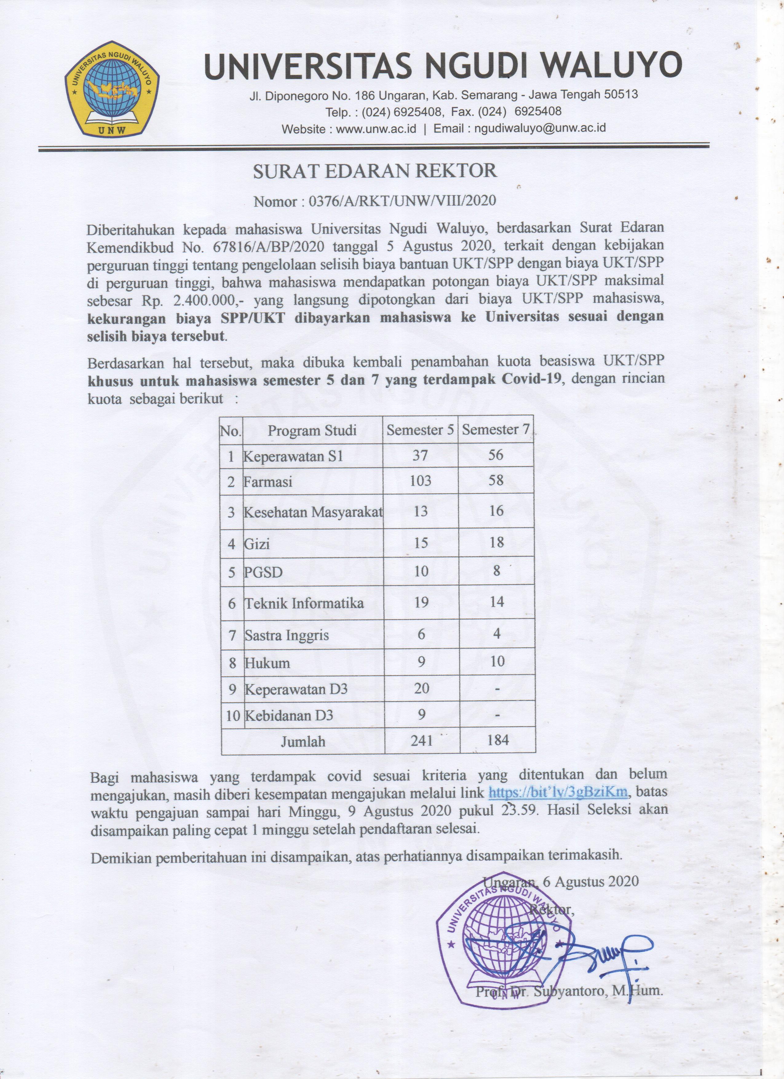 Diberitahukan kepada mahasiswa Universitas Ngudi Waluyo, berdasarkan Surat Edaran Kemendikbud No. 67816/A/BP/2020 tanggal 5 Agustus 2020, terkait dengan kebijakan perguruan tinggi tentang pengelolaan selisih biaya bantuan UKT/SPP dengan biaya UKT/SPP di perguruan tinggi, bahwa mahasiswa mendapatkan potongan biaya UKT/SPP maksimal sebesar Rp. 2.400.000,- yang langsung dipotongkan biaya UKT/SPP mahasiswa, kekurangan biaya SPP/UKT tetap dibayarkan mahasiswa ke Universitas sesuai dengan Selisih biaya tersebut. (Misalnya UKT/SPP =Rp. 8.500.000, dipotong Rp. 2.400.000 = Rp. 6.100.000,- tetap dibayarkan ke Universitas).Berdasarkan hal tersebut, maka dibuka kembali penambahan kuota beasiswa UKT/SPP khusus untuk mahasiswa semester 5 dan 7 yang terdampak Covid-19, dengan rincian sebagai berikut :Program Studi SMT3 SMT5 …
