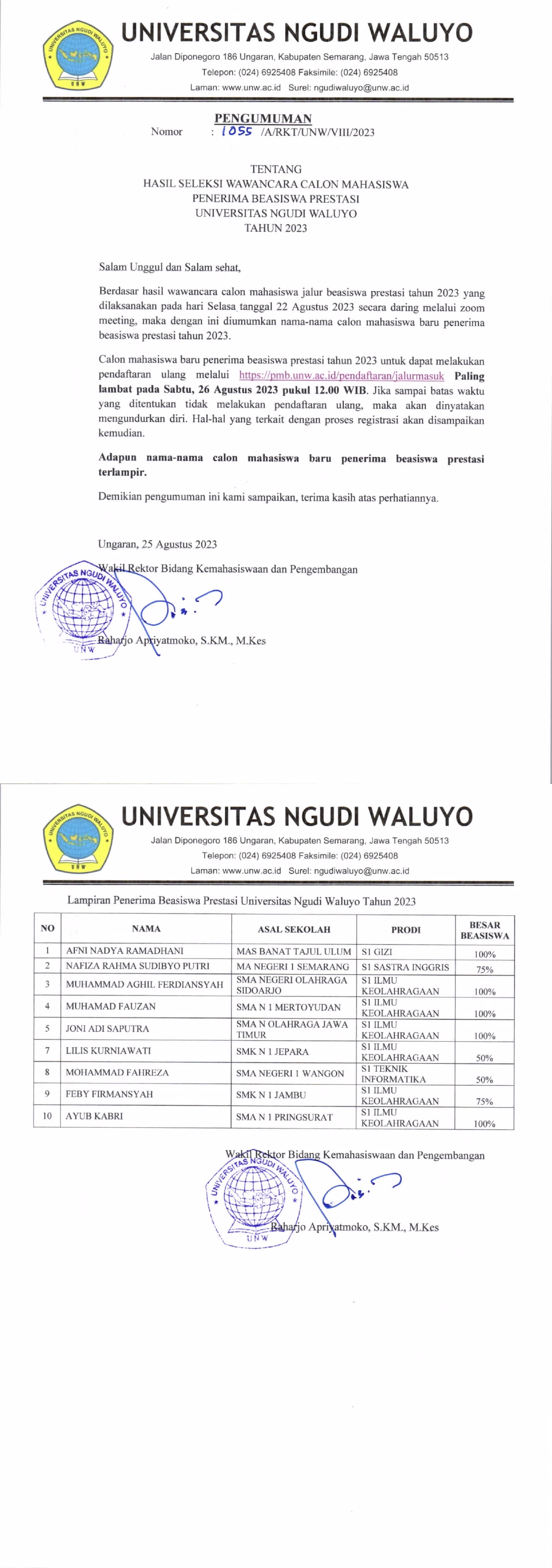 PENGUMUMAN LOLOS BEASISWA PRESTASI TAHUN 2023 UNIVERSITAS NGUDI WALUYO