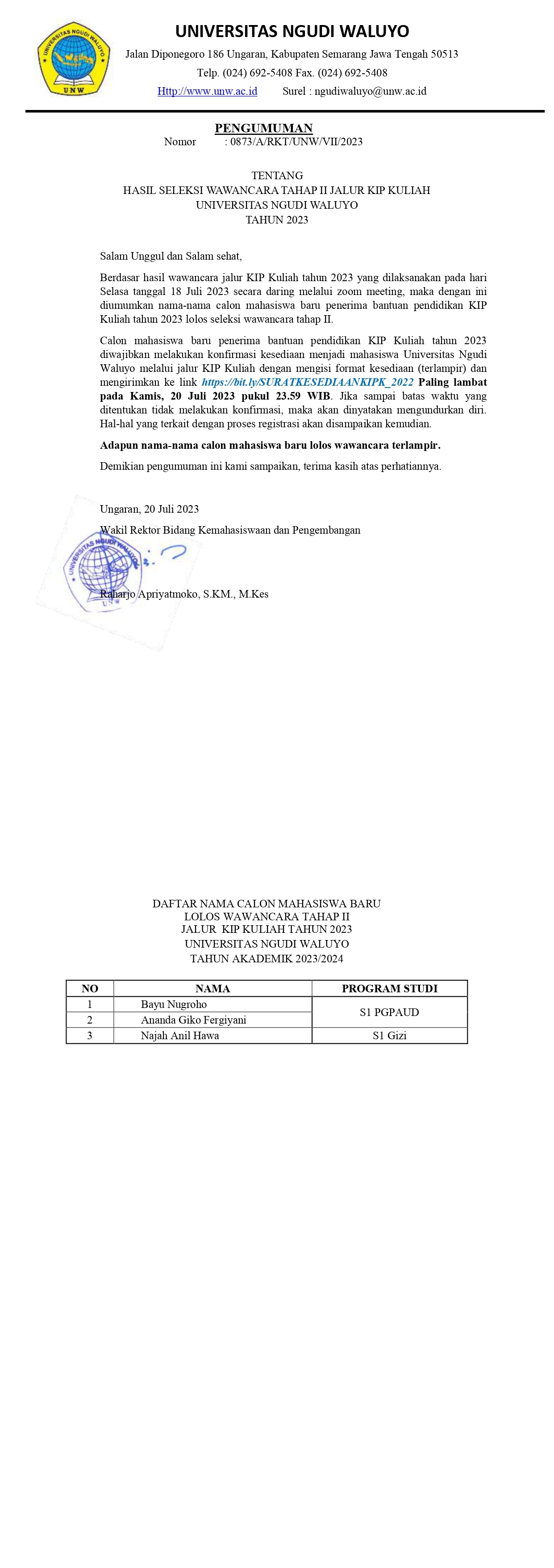 Selamat bagi peserta yang telah lolos seleksi KIP Kuliah 2023 Tahap II Universitas Ngudi Waluyo.Segera lakukan penguploadtan surat kesediaan menjadi mahasiswa melalui jalur KIP Kuliah tahun 2023 (File Terlampir) Unggah pada :https://bit.ly/SURATKESEDIAANKIPK_2023