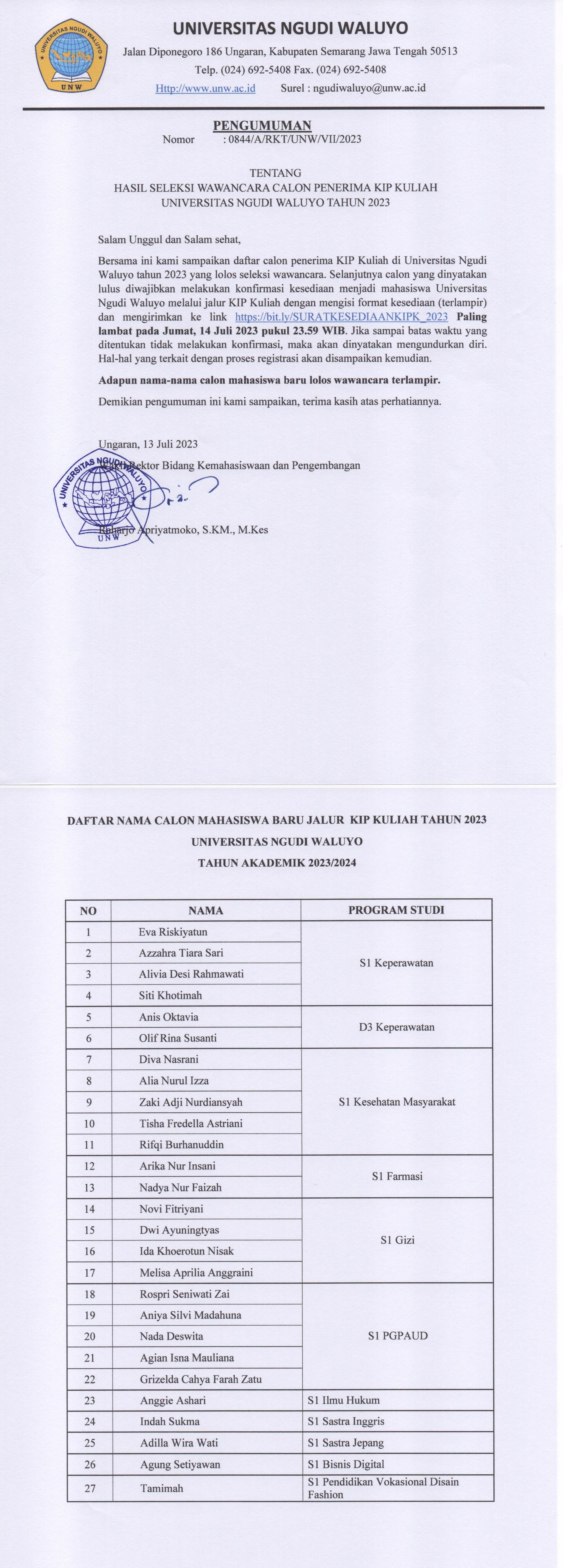 Selamat bagi peserta yang telah lolos seleksi KIP Kuliah 2023 Universitas Ngudi Waluyo.Segera lakukan penguploadtan surat kesediaan menjadi mahasiswa melalui jalur KIP Kuliah tahun 2023 (File Terlampir) Unggah pada :https://bit.ly/SURATKESEDIAANKIPK_2023