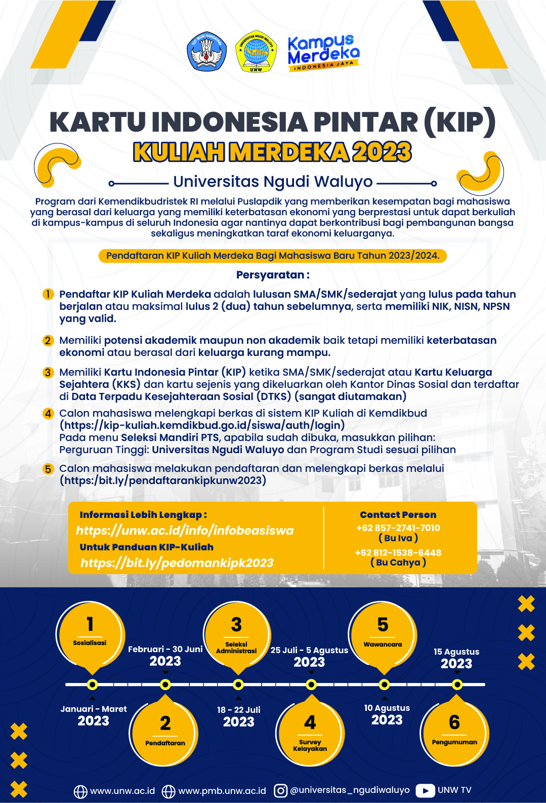 PENDAFTARAN BEASISWA DARI PEMERINTAH (KIP KULIAH) BAGI MAHASISWA BARU TAHUN 2023/2024.SYARAT:1. Pendaftar Beasiswa KIP Kuliah adalah siswa SMA atau sederajat yang lulus atau akan lulus pada tahun 2023 atau telah dinyatakan lulus maksimal 2 tahun sebelumnya, serta memiliki NISN, NPSN dan NIK yang valid;2. Memiliki potensi akademik maupun non akademik baik tetapi memiliki keterbatasan ekonomi / dari Keluarga Kurang Mampu;3. Memiliki Kartu KIP/Kartu Keluarga Sejahtera dan kartu sejenis yang dikeluarkan oleh Kantor Dinas Sosial dan terdaftar di Data Terpadu Kesejahteraan Sosial (DTKS) (sangat diutamakan)4. Calon mahasiswa melengkapi berkas di sistem KIP Kuliah kemendikbud https://kip-kuliah.kemdikbud.go.id/siswa/auth/login5. Mahasiswa melakukan pendaftaran dan melengkapi berkas melalui https://bit.ly/pendaftarankipkunw20236. Info…