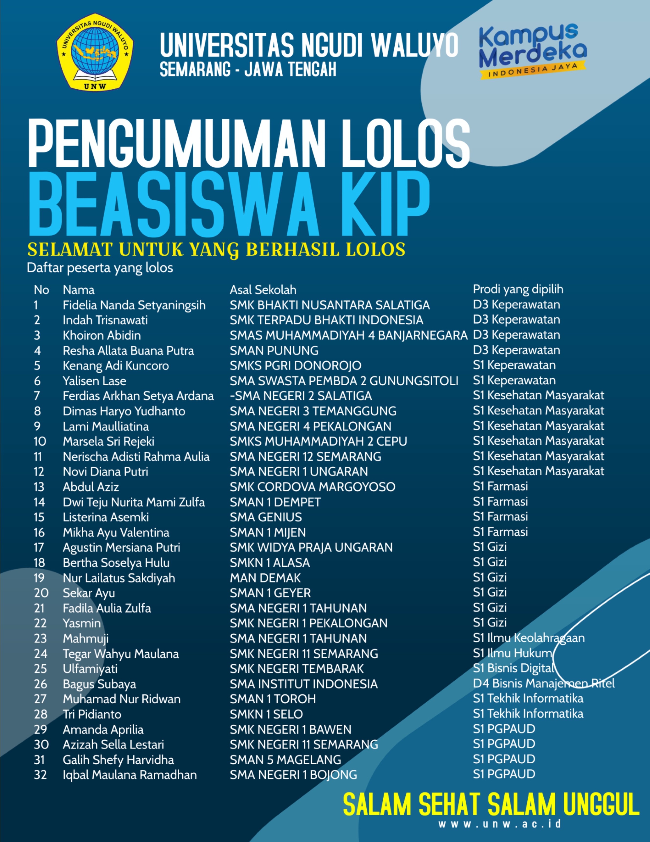 Berikut kami sampaikan daftar mahasiswa yang lolos seleksi program KIP Kuliah Universitas Ngudi Waluyo, untuk Langkah selanjutnya untuk teman-teman memastikan sudah melakukan pendaftaran melalui http://pmb.unw.ac.id:1252/pendaftaran/pmb/pemerimaan-mahasiswa-baru-universitas-ngudi-waluyoKami Ucapkan Selamat bergabung di UNW.Selamat bagi teman-teman yang lolos.