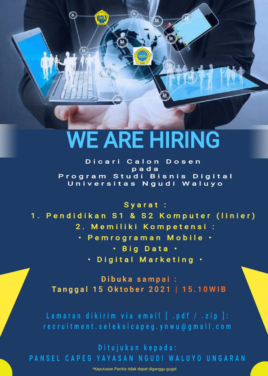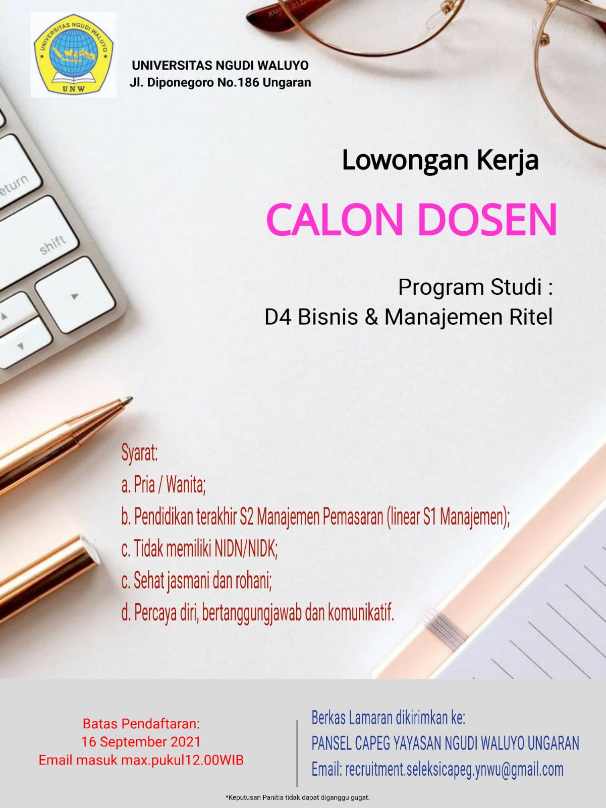 Dibuka lowongan dosen pada Program Studi D4 Bisnis dan Manajemen Ritel, dengan syarat-syarat yang terlampir dalam poster tersebut.Batas pendaftaran maksimal tanggal 16 Sepetember 2021