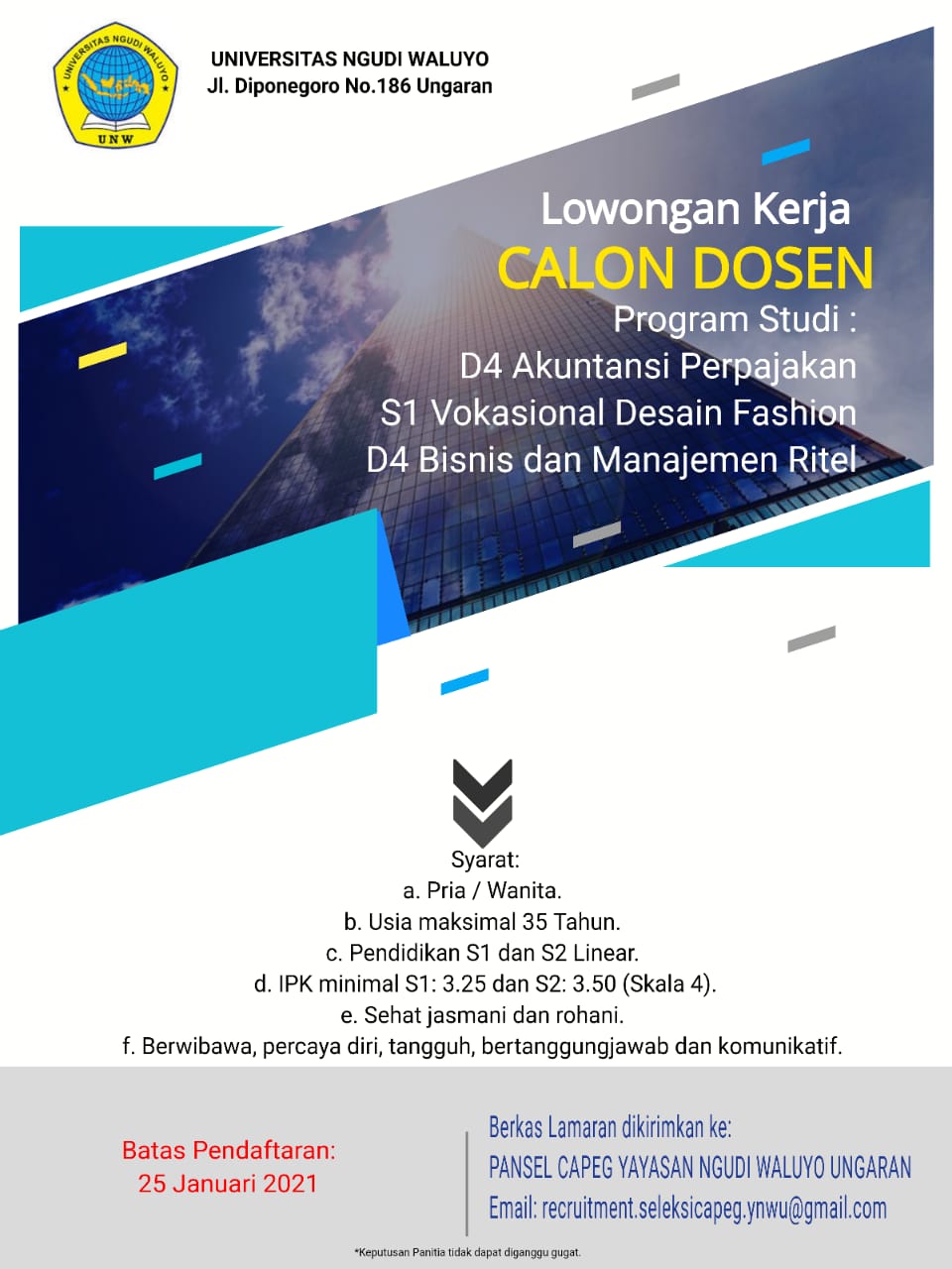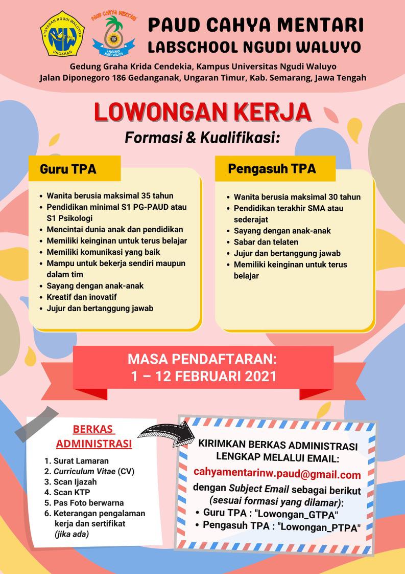 Universitas Ngudi Waluyo adalah perguruan tinggi swasta yang sedang berkembang pesat. Berlokasi di ungaran, membuka kesempatan menjadi dosen pada progran studi Bisnis Digital.Syarat:Pendidikan S1 dan S2 Komputer LinearMemiliki Kompetensi: a. Pemrograman Mobile b. Big Data c. Digital MarketingPaling lambat : 16 April 2021 | 12.00 WIB