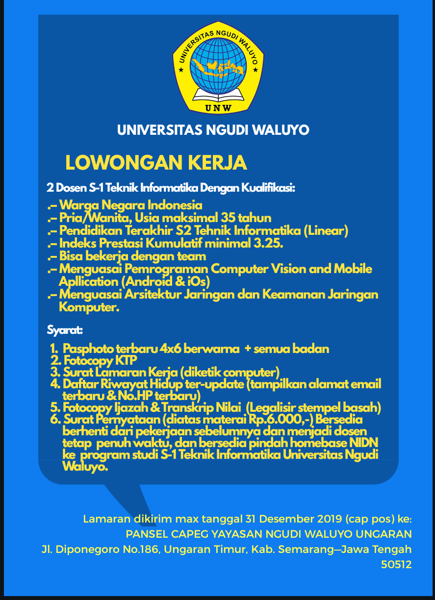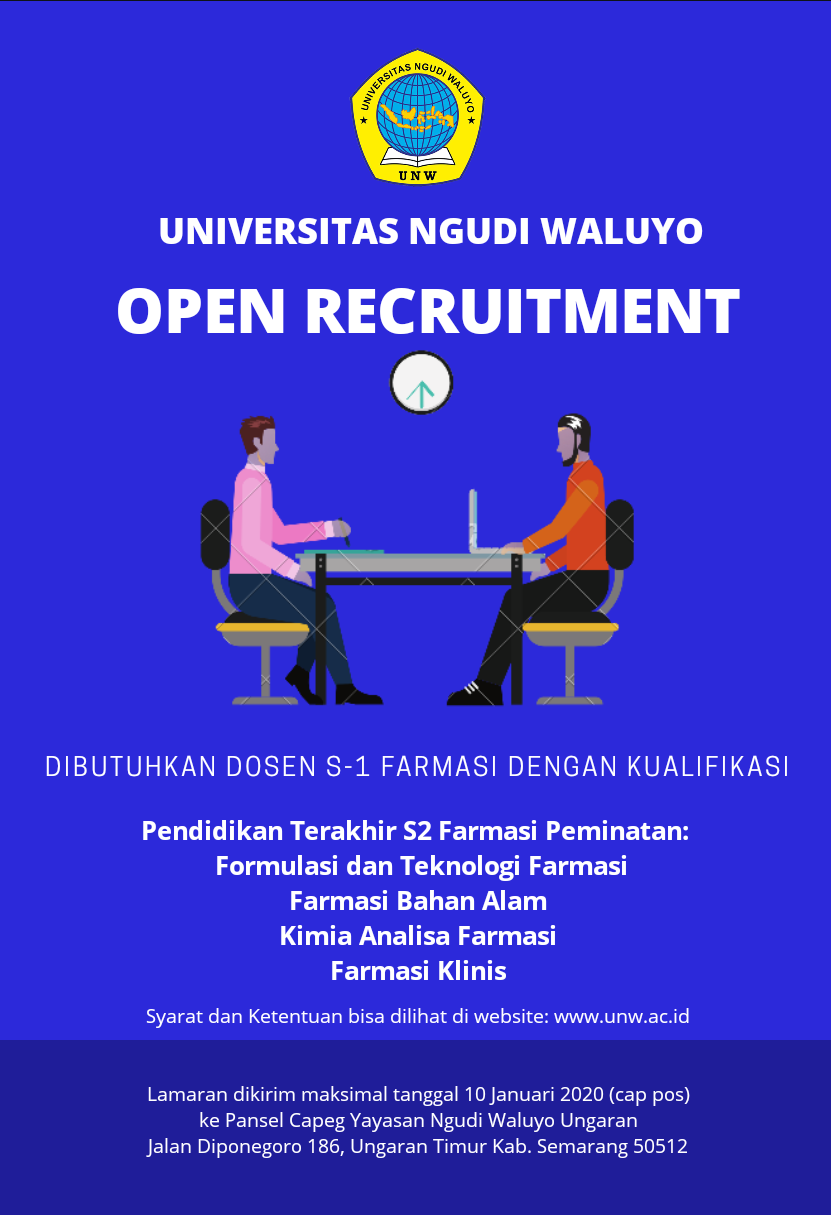 Dibutuhkan 8 (Delapan) Dosen S-1 Farmasi, dengan kualifikasia. Warga Negara Indonesiab. Pria/Wanita, Usia maksimal 35 tahun c. Pendidikan Terakhir S2 Farmasi [khusus peminatan Formulasi dan Teknologi Farmasi; Farmasi Bahan Alam; Kimia Analisa Farmasi; Farmasi Klinis]d. Indeks Prestasi Kumulatif minimal 3.25. e. Bisa bekerja dengan team Syarat : 1. Pasphoto terbaru 4x6 berwarna + semua badan2. Fotocopy KTP3. Surat Lamaran Kerja (diketik computer)4. Daftar Riwayat Hidup ter-update (tampilkan alamat email terbaru & No.HP terbaru)5. Fotocopy Ijazah & Transkrip Nilai S1 Farmasi (Legalisir stempel basah)6. Fotocopy Ijazah & Transkrip Nilai Profesi Farmasi (Legalisir stempel basah)7. Fotocopy Ijazah & Transkrip Nilai S2 Farmasi (Legalisir stempel basah)8. Surat Pernyataan (diatas materai Rp.6.000,-) Bersedia berhenti dari pekerjaan sebelumnya dan menjadi dosen tetap penuh waktu, dan bersedia…