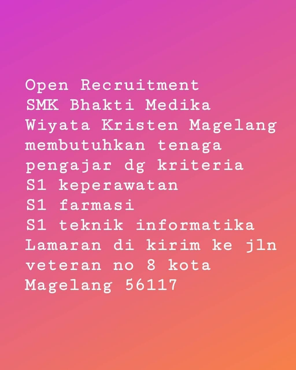 Open Recruitment SMK Bhakti Wiyata Magelang. Untuk Alumni UNW dari S1 Keperawatan dan S1 Farmasi yang ingin berkarier sebagai Tenaga Pengajar di SMK Bhakti Wiyata Magelang dapat mengirimkan lamaran dan CV ke SMK Bhakti Wiyata, Jln. Veteran no. 8 Kota Magelang, 56117.