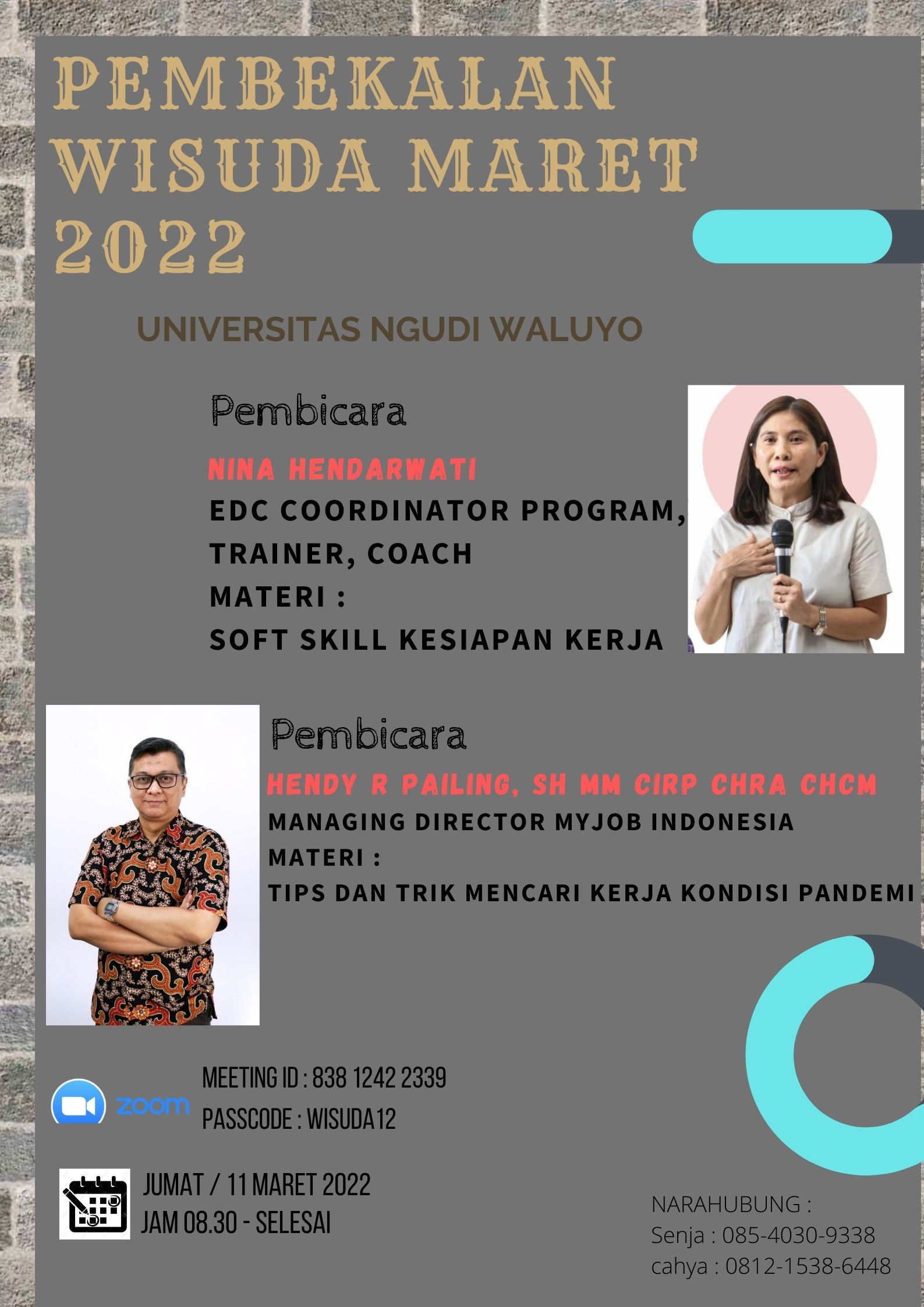 Bersama ini kami sampaikan beberapa pengumuman terkait persiapan pelaksanaan WISUDA XII periode Maret Tahun 2022 Universitas Ngudi Waluyo yaitu Pembekalan Wisudawan Maret Universitas Ngudi Waluyo Tahun 2022. Yang akan dilaksanakan pada hari Jumat tanggal 11 Maret 2022 Jam 08.30 - Selesai Tempat Zoom Meeting ( Meeting ID : 838 1242 2339, passcode : WISUDA12).Sekian Informasi yang bisa kami sampaikan. Terimakasih