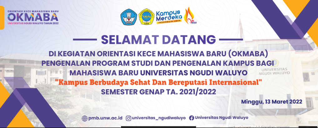 Selamat datang mahasiswa baru Universitas Ngudi WaluyoSehubungan dengan telah dimulainya registrasi semester Genap tahun akademik 2021/2022 bagi mahasiswa baru yang telah melakukan registrasi di PMB dan akan mengikuti kuliah di semster Genap tahun akademik 2021/2022 maka *WAJIB mengikuti rangkaian Pengenalan Kehidupan Kampus bagi Mahasiswa Baru (PKKMB ) atau yang kita sebut dengan Orientasi Kece Mahasiswa baru* secara daring pada :Hari : MingguTanggal : 13 Maret 2022Waktu : 07.00 s/d 13.00 WIBZoom Meeting ID: 326 067 0349Passcode: UNW atauKlik https://us02web.zoom.us/j/3260670349?pwd=NzRtVUV6eTZwNXFRc2pkRnViOFQ2QT09Selama kegiatan berlangsung mahasiswa baru WAJIB:1. mengenakan Baju atasan berwarna putih dan bawahan berwarna Hitam,Jika mahasiswa berhijab maka Hijab berwarna Hitam. 2. Menggunakan background Okemaba (terlampir)3. Wajib mengikuti seluruh rangkaian sesi kegiatan4. Mengunggah twitbone okemaba di twb.nz/okmabaunw2022 dengan hastag #UniversitasNgudiWaluyo dan…