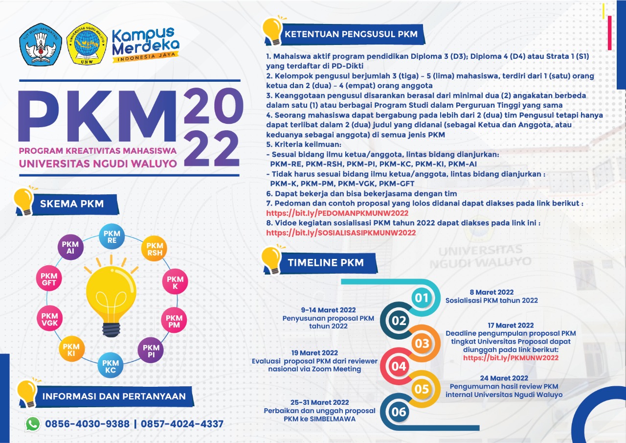 IKUTI PROGRAM KREATIFITAS MAHASISWAGO TO PIMNAS SUKSESKAN PKM UNWPANDUAN DAN CONTOH PROPOSAL YANG SUKSES TEMBUS PIMNAS KLIK https://bit.ly/PEDOMANPKMUNW2022DAFTARKAN DAN UPLOAD PROPOSAL DI https://bit.ly/PKMUNW2022proposal PKM yg lolos seleksi mulai pada tahap I sudah dapat diakui sebagai kredit kuliah sebesar 2-7 sks (metodologi penelitian, skripsi, tugas akhir, KKN, dll)