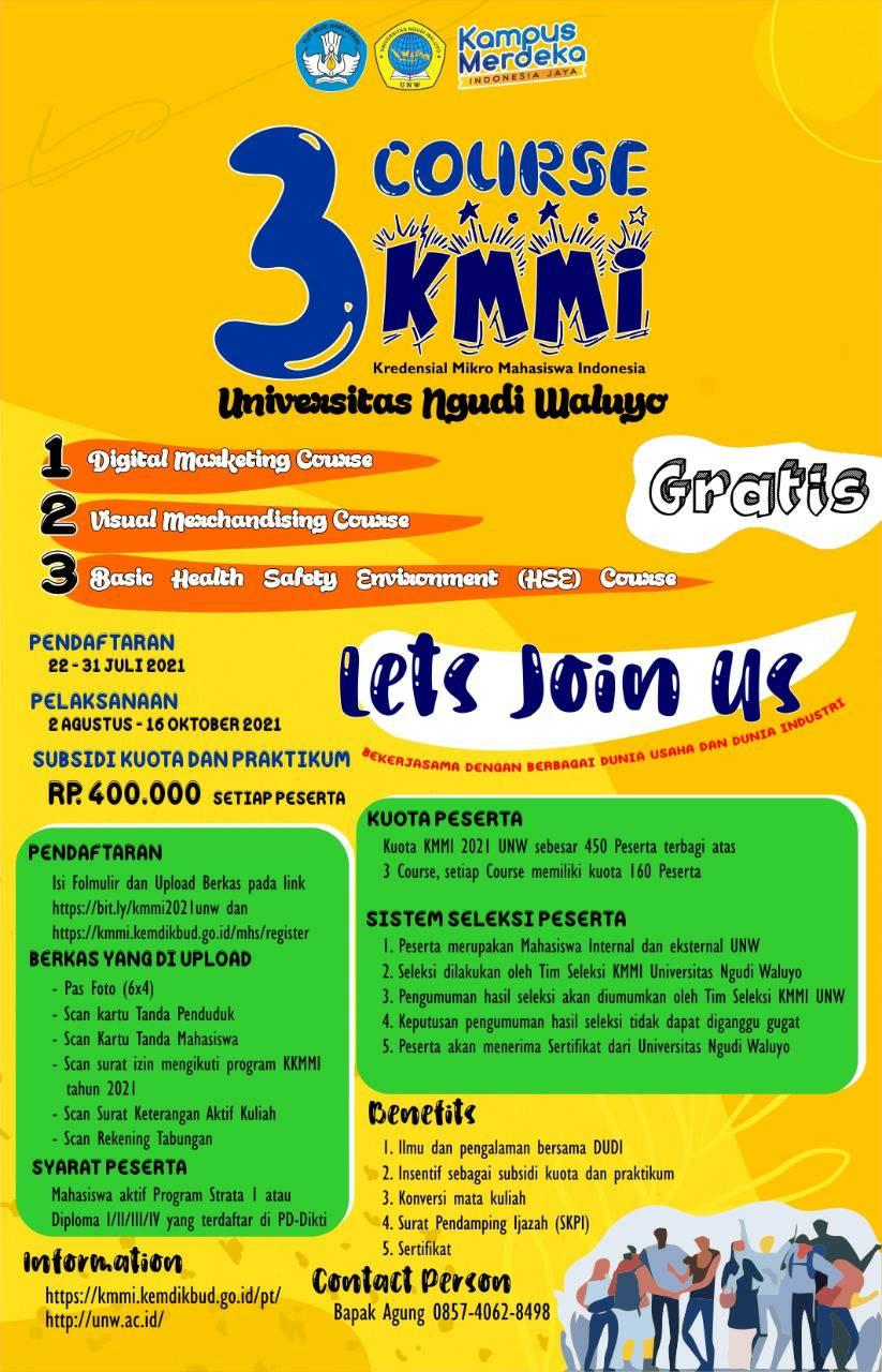 Pada kesempatan kali ini UNW melalui UPT Pengembangan Sertifikasi & Kompetensi Mahasiswa, mengajukan proposal KMMI dengan menargetkan sejumlah 480 mahasiswa dengan membuka 3 (tiga) courses , antara lain Digital Marketing Course, Visual Merchandising Course, dan Basic Health Safety Environment (HSE) Course. Ketiga course tersebut masing-masing memiliki kelebihan yang diharapkan dapat membekali para mahasiswa dengan tambahan soft skill yang bermanfaat, selain itu tenaga pendidik pada masing-masing course telah tersertifikasi dan telah berpengalaman di bidangnya masing-masing dan memiliki jabatan fungsional minimal asisten ahli.Kuota untuk 3 kursus yang dibuka sejumlah 480 dan diharapkan semua mahasiswa UNW dengan jenjang pendidikan SARJANA bisa mengikuti program KMMI ini, karena banyak benefit yang akan mahasiswa dapatkan. Informasi pendaftaran dan seputar kmmi bisa didapatkan dengan bergabung di grup telegram berikut https://t.me/joinchat/B7IqEQkLGMs0YzI1