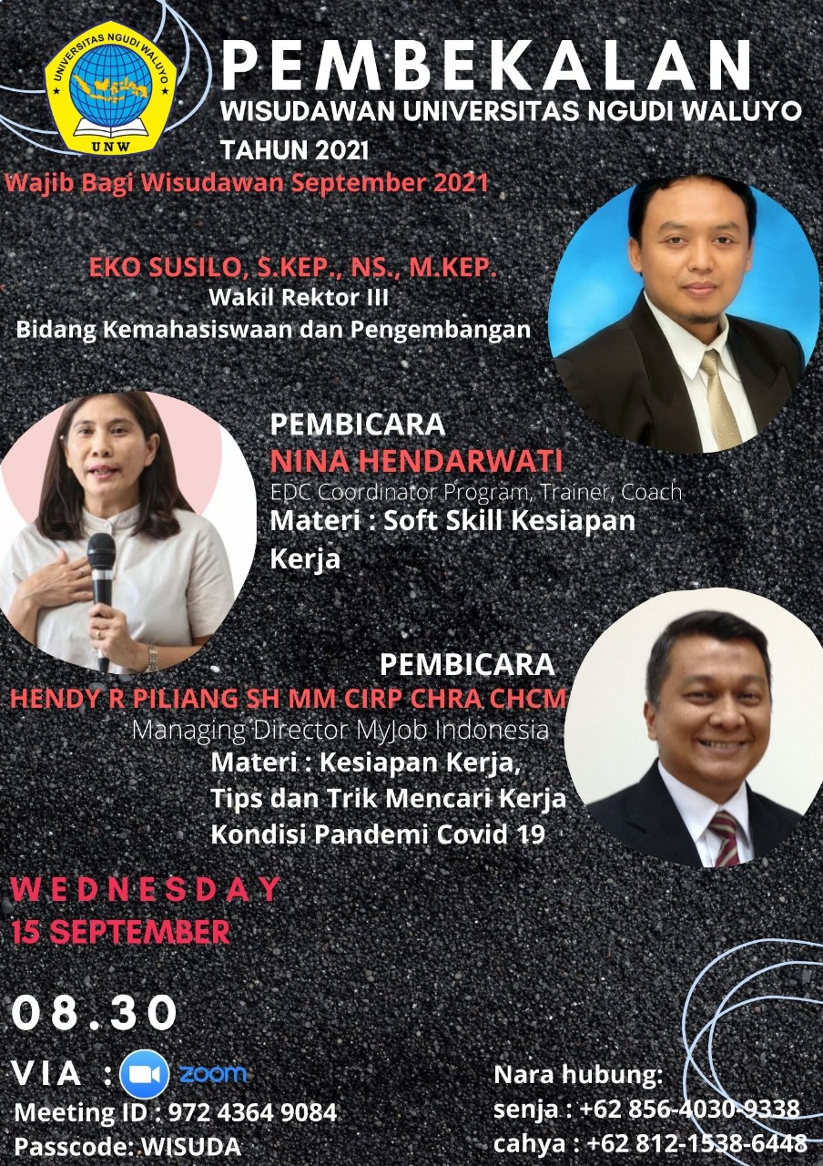 Di beritahukan kepada Seluruh Calon Wisudawan Universitas Ngudi Waluyo Periode September Ke XI tahun 2021 untuk WAJIB mengikuti pembekalan Wisuda pada Hari RabuTanggal 15 September 2021, Pukul 09.00, Melalui Zoom Meeting . Virtual Background dapat didownload pada lampiran dan digunakan besok pada saat pembekalan. Selain Itu menginfokan juga bagi mahasiswa yang kehadiran wisuda adalah dengan metode drive thru, Stiker Mobil dan Kartu konsumsi dapat diambil di gedung M, lantai satu (1) Di tempat pak. Bagas. Join Zoom Meetinghttps://zoom.us/j/97243649084?pwd=azY3OUtneEpPZ3VoY3NIQXBNY1oxQT09Meeting ID: 972 4364 9084Passcode: WISUDA
