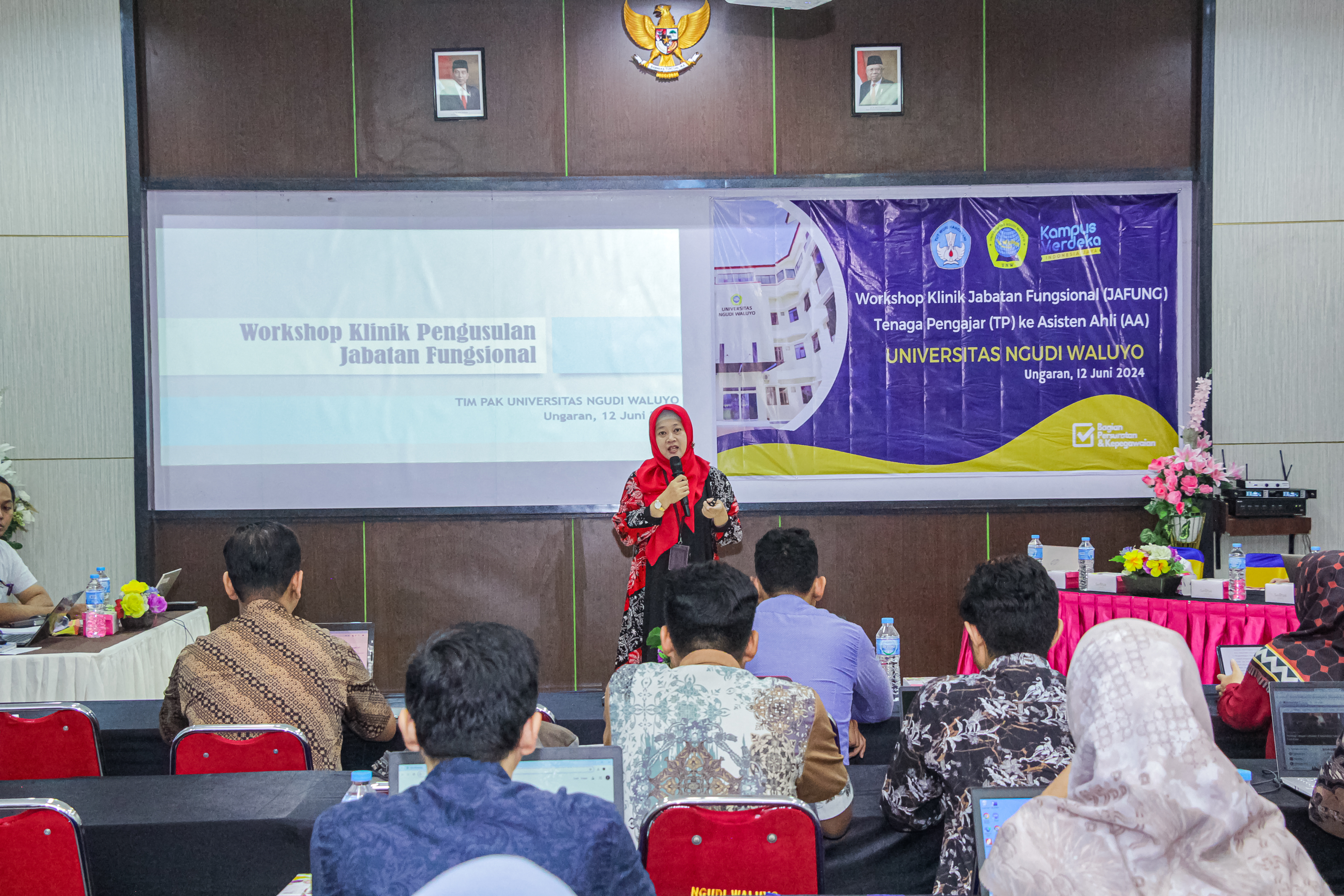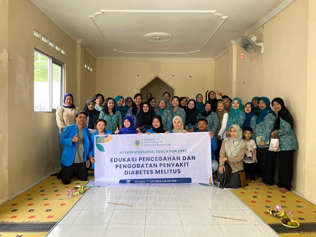 Mahasiswa Fakultas Kesehatan dari Prodi Farmasi (Noverina Indah D., Yosepha Indira P. M., Luluq Azizah P., Septina Putri dan Ferlambang Adhi S.) dan Prodi Ilmu Keolahragaan (Muhamad Syarifudin H.) berkolaborasi dalam sebuah kegiatan Interprofesional Education (IPE) didampingi oleh dosen pembimbing ibu Ika Nilawati, S.Or., M.Or. Kegiatan ini dilakukan di Balai Pertemuan Perumahan Ungaran Asri, Candirejo pada tanggal 07 Juli 2024.Tema yang diusung dari kelompok 5 IPE ini yaitu "Edukasi Pencegahan dan Pengobatan Diabetes Melitus". Acara dimulai dengan pemaparan materi dan dilanjutkan dengan senam untuk penderita Diabetes Melitus (DM) yang diikuti oleh 28 ibu PKK Perumahan Ungaran Asri, Candirejo. Antusias peserta dapat dilihat dari keaktifan peserta dengan mengajukan beberapa pertanyaan dan memperhatikan pemaparan materi. Di akhir sesi ditutup dengan pembagian goody bag, pen dan leaflet yang di support oleh PMB Universitas Ngudi Waluyo.