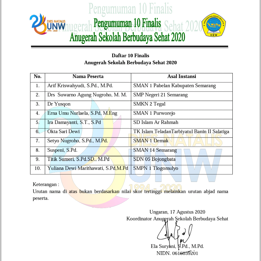 Universitas Ngudi Waluyo menyelenggarakan Wisuda IX secara "Drive Thru" di halaman Rektorat UNW pada 16-17 September 2020. Acara wisuda tersebut diselenggarakan dengan mengacu pada protokol kesehatan yang ketat. Dalam kesempatan itu, Rektor UNW, Prof. Dr. Subyantoro, M.Hum. mengatakan rasa syukurnya masih bisa menyelenggarakan wisuda secara drive thru dengan memperhatikan protokol kesehatan yang ketat meskipun panitia harus mengatur beberapa agenda dan rangkaian acara agar sesuai dengan protokol kesehatan. Menurutnya, wisuda drive thru adalah jalan tengah dengan tetap mempertimbangkan aspek kesehatan dan keselamatan warga kampus, namun tetap bisa merayakan hari kebahagiaan para alumni setelah menempuh kuliah di UNW. UNW kali ini mewisuda sebanyak 448 wisudawan dengan rerata IPK 3.35 dengan lama studi sarjana rata-rata 8.17 semester. "Sejak berdirinya kampus ini, telah mewisuda sebanyak 12.960 wisudawan, saya sampaikan bahwa tingkat kelulusan UNW makin meningkat dari periode ke periode,"terangnya.…