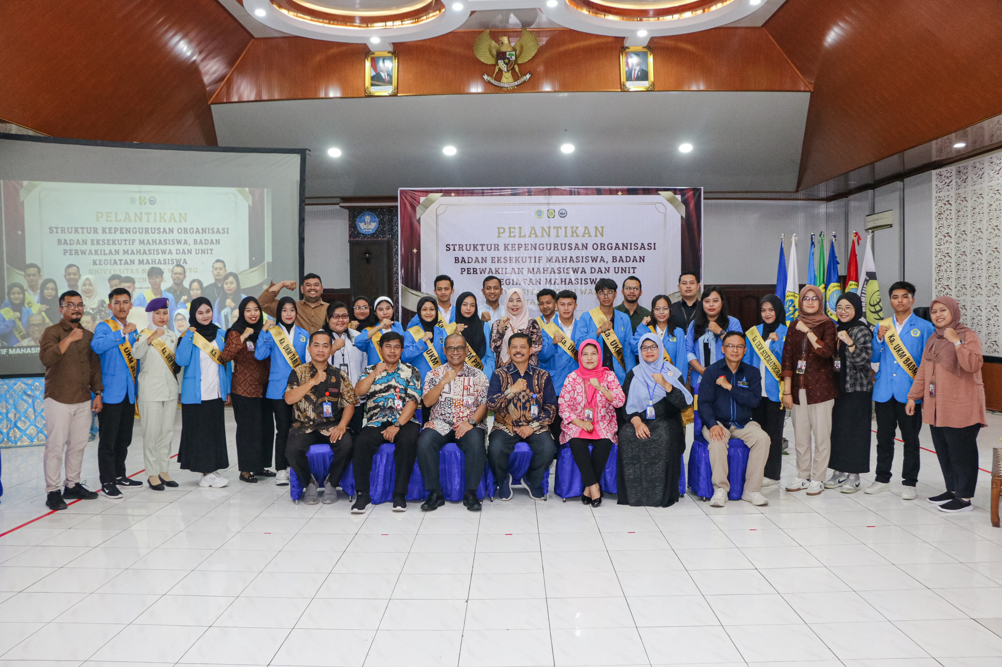 Ungaran, 21 Januari 2025 – Universitas Ngudi Waluyo (UNW) menggelar pelantikan struktur kepengurusan organisasi mahasiswa (Ormawa) tahun 2025 yang meliputi Badan Eksekutif Mahasiswa (BEM), Badan Perwakilan Mahasiswa (BPM), dan Unit Kegiatan Mahasiswa (UKM). Acara bertema “Revolusioner Kepemimpinan untuk UNW yang Unggul dan Berdaya Saing” ini berlangsung di Aula Gedung H.M. Iskak Soepardi, dihadiri oleh para pimpinan universitas, pembimbing Ormawa, serta seluruh anggota organisasi mahasiswa. Acara dimulai dengan pembukaan resmi yang mencakup doa, menyanyikan lagu Indonesia Raya, serta Mars Universitas Ngudi Waluyo. Selanjutnya, Komisi Pemilihan Raya (KPR) menyampaikan laporan mengenai proses pemilihan dan seleksi struktur baru Ormawa. Puncak acara ditandai dengan pembacaan Surat Keputusan (SK) pelantikan pengurus Ormawa oleh Wakil Rektor III, Bapak Raharjo Apriyatmoko, S.KM., M.Kes. Para pengurus, termasuk Ketua BEM, Ketua BPM, dan Ketua UKM, melaksanakan pengucapan sumpah/janji jabatan. Prosesi dilanjutkan dengan penandatanganan berita acara pelantikan dan penyematan simbol jabatan sebagai wujud resmi pengangkatan mereka. Berikut adalah daftar nama Ormawa di UNW beserta nama pembimbingnya: 1. Badan Eksekutif Mahasiswa (BEM) dan Badan Perwakilan Mahasiswa (BPM): Pembimbing: Raharjo Apriyatmoko, S.KM., M.Kes. 2. UKM Ilmiah dan Penalaran: Pembimbing: Apt. Dedi Haswan, S.Farm., M.Clin. Pharm. 3. UKM Kewirausahaan: Pembimbing: Jaya Ramadaey Bangsa, S.E., M.M. 4. UKM Basket: Pembimbing: Ika Nilawati, S.Si., M.Or., AIFO. 5. UKM Badminton: Pembimbing: Cahya Nugraheni, S.Pd. 6. UKM UKKI (Unit Kegiatan Kerohanian Islam): Pembimbing: Aristiyanto, S.Si., M.Pd. 7. UKM Futsal: Pembimbing: Galeh Septiar Pontang, S.Gz., M.Gizi. 8. UKM Jelata (Jelajah Alam dan Petualangan): Pembimbing: M. Firdaus Aldise, S.E. 9. UKM Khataros Youth: Pembimbing: Wahyu Kristingrum, S.SiT., M.H. 10. UKM Menwa (Resimen Mahasiswa): Pembimbing: Joko Suryanto. 11. UKM Silat: Pembimbing: Agus Guntur B., S.ST. 12. UKM Paduan Suara: Pembimbing: Ari Tavyanti Ardik Sholikha, S.Pd. 13. UKM Musik: Pembimbing: Irwan, S.Ak. 14. UKM Tari dan Pagelaran: Pembimbing: Reza Gharini, S.Pd. 15. UKM Racana Soedirman-Kartini (Pramuka): Pembimbing: Dr. Nur Intan Rochmawati, S.Pd., M.Pd. 16. UKM Sinematografi: Pembimbing: Setya Indah Isnawati, S.I.Kom., M.M. 17. UKM Voli: Pembimbing: Rohman Mafbur, S.Kom. Setiap pembimbing memiliki peran penting dalam mendukung dan memotivasi mahasiswa agar terus mengembangkan potensi mereka di bidang masing-masing. Dengan adanya pembimbing-pembimbing ini, diharapkan kegiatan mahasiswa di UNW semakin terarah, inovatif, dan mampu menghasilkan prestasi yang membanggakan di tingkat lokal maupun nasional. Dalam sambutannya, Ketua BEM dan Ketua BPM yang baru dilantik menyampaikan visi mereka untuk meningkatkan keterlibatan mahasiswa dalam berbagai kegiatan yang mendukung prestasi akademik maupun non-akademik. "Kami berkomitmen untuk menjadi jembatan aspirasi mahasiswa, membangun UNW yang lebih progresif," ujar Ketua BEM. Rektor UNW, Prof. Dr. Subyantoro, M.Hum memberikan penguatan kepada para pengurus baru, menekankan pentingnya kepemimpinan yang tangguh dan inovatif di era globalisasi. "Kalian adalah wajah dari masa depan UNW. Mari wujudkan UNW yang unggul dan berdaya saing melalui semangat kolaborasi dan inovasi," pesannya. Acara diakhiri dengan hiburan, ramah tamah, dan sesi foto bersama yang mencerminkan semangat kebersamaan seluruh keluarga besar Universitas Ngudi Waluyo. Dengan pelantikan ini, diharapkan pengurus Ormawa mampu membawa perubahan positif, menjadikan UNW sebagai kampus yang terus berinovasi dan berprestasi. |